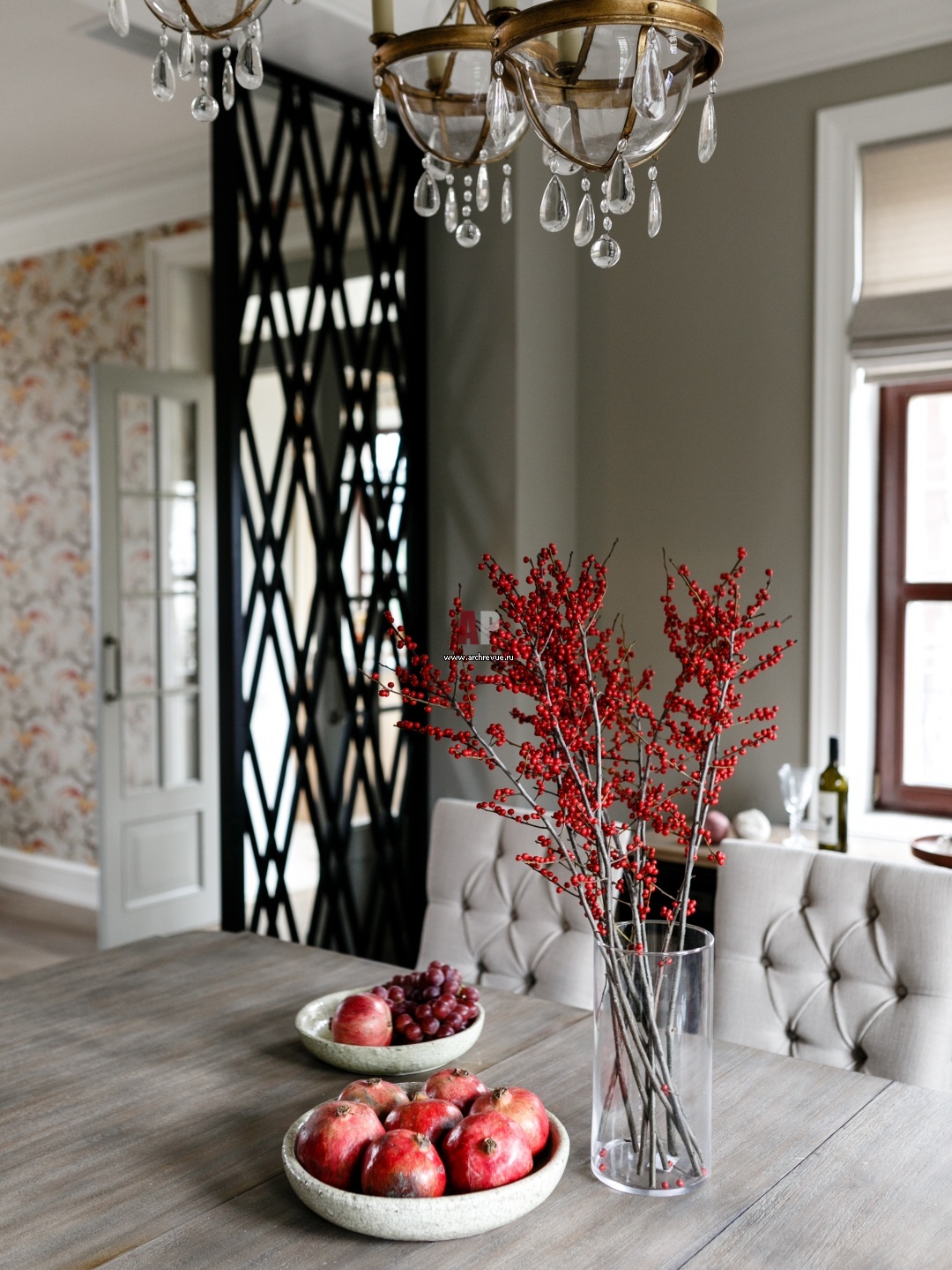 Праздничная сервировка обеденного стола в частном загородном доме.