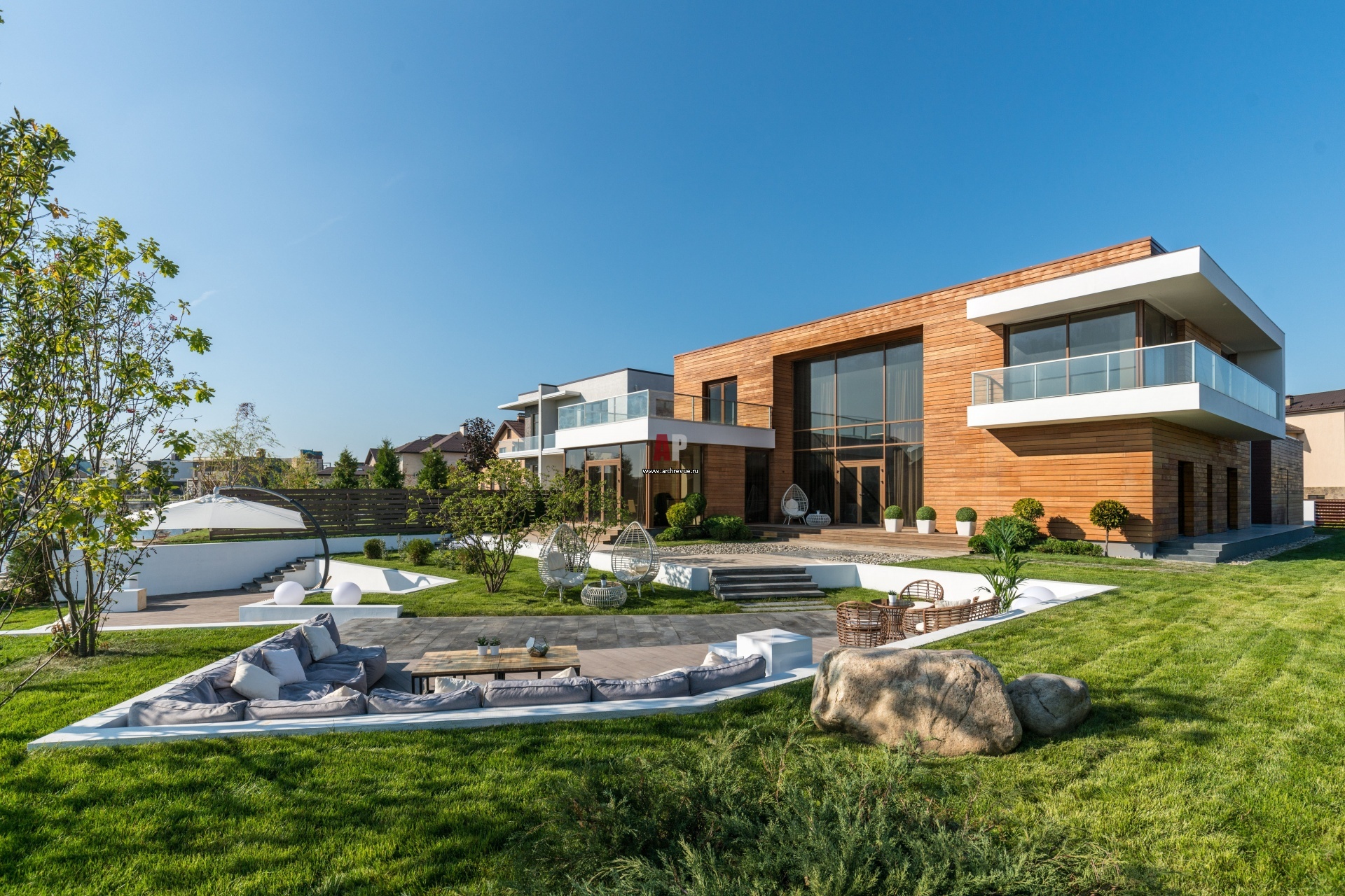 Архитекторы бюро «А+А» придали фасадам завершенный вид и оформили ландшафт. Участок перед домом поделен на несколько площадок-террас, которые спускаются к искусственному водоему.