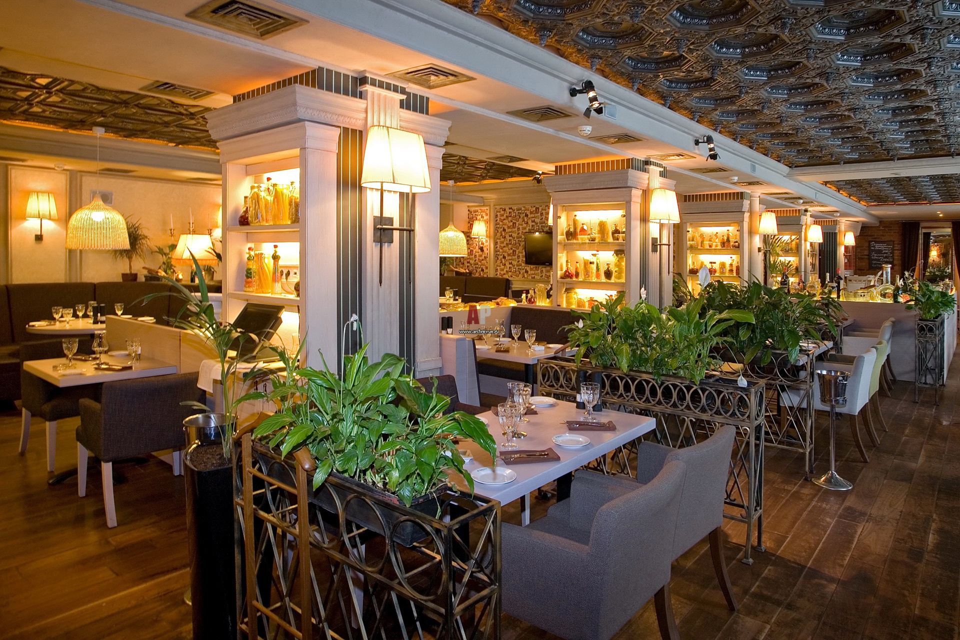 Дизайн интерьера основного зала итальянского ресторана с элементами кантри. Несущие колонны оформлены открытыми витринами из выбеленного дуба с подсветкой. Изготовление, Beni. Кованые цветочницы добавляют национального итальянского колорита.