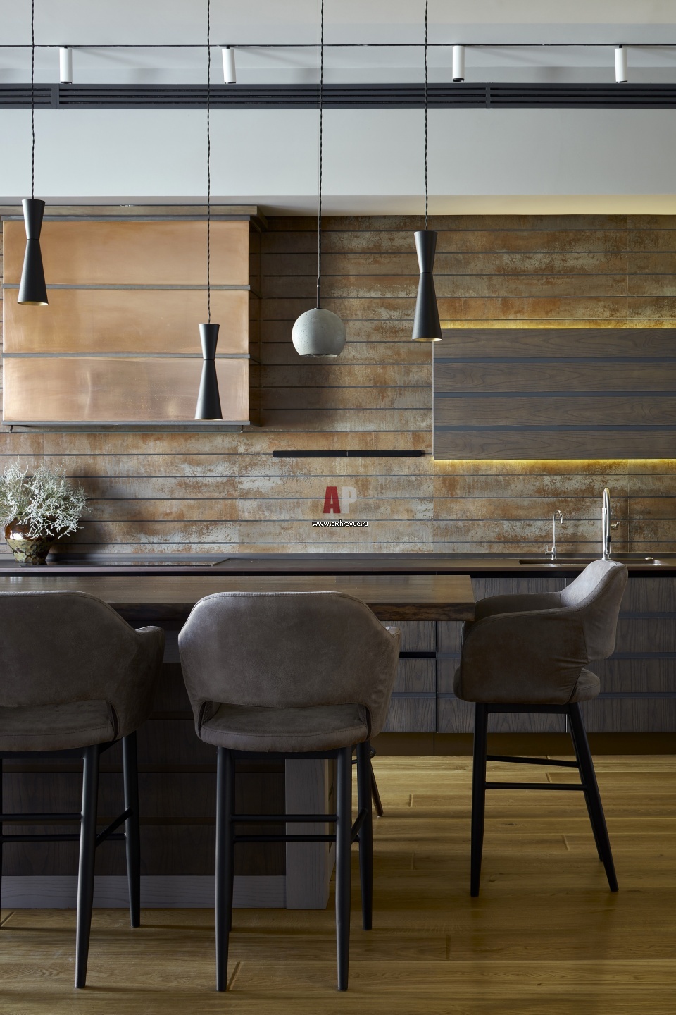 Технологичная квартира на Пречистенской набережной. Интерьер кухни с барным островом выполнен в стилистике минимализма.