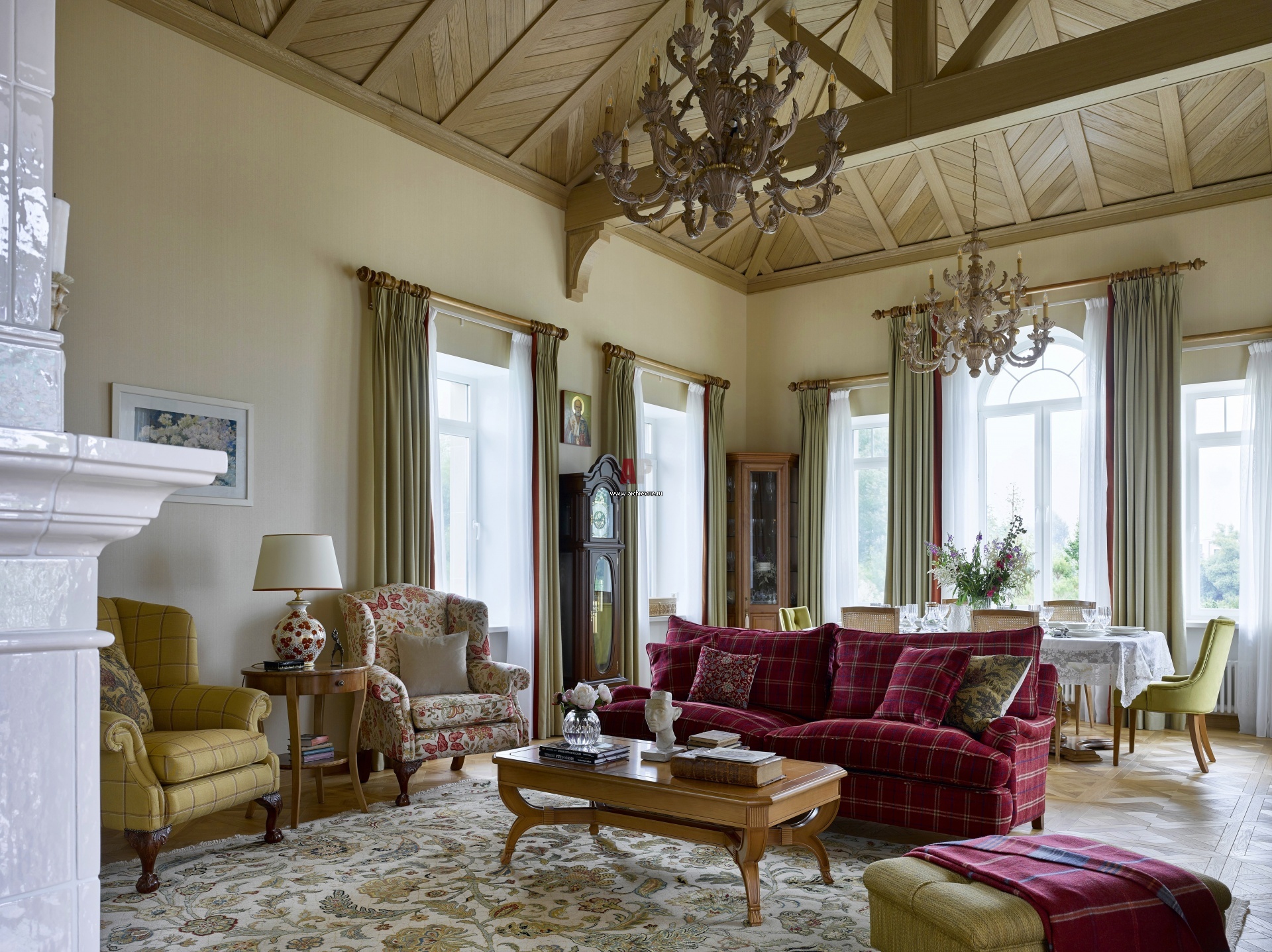 Гостиная расположена в отдельном двусветном объеме. В оформлении использованы натуральные материалы и естественные природные оттенки: теплые бежевые, терракотовые, оливковые. Диван и кресла, Duresta. Центральная люстра, Chelini.