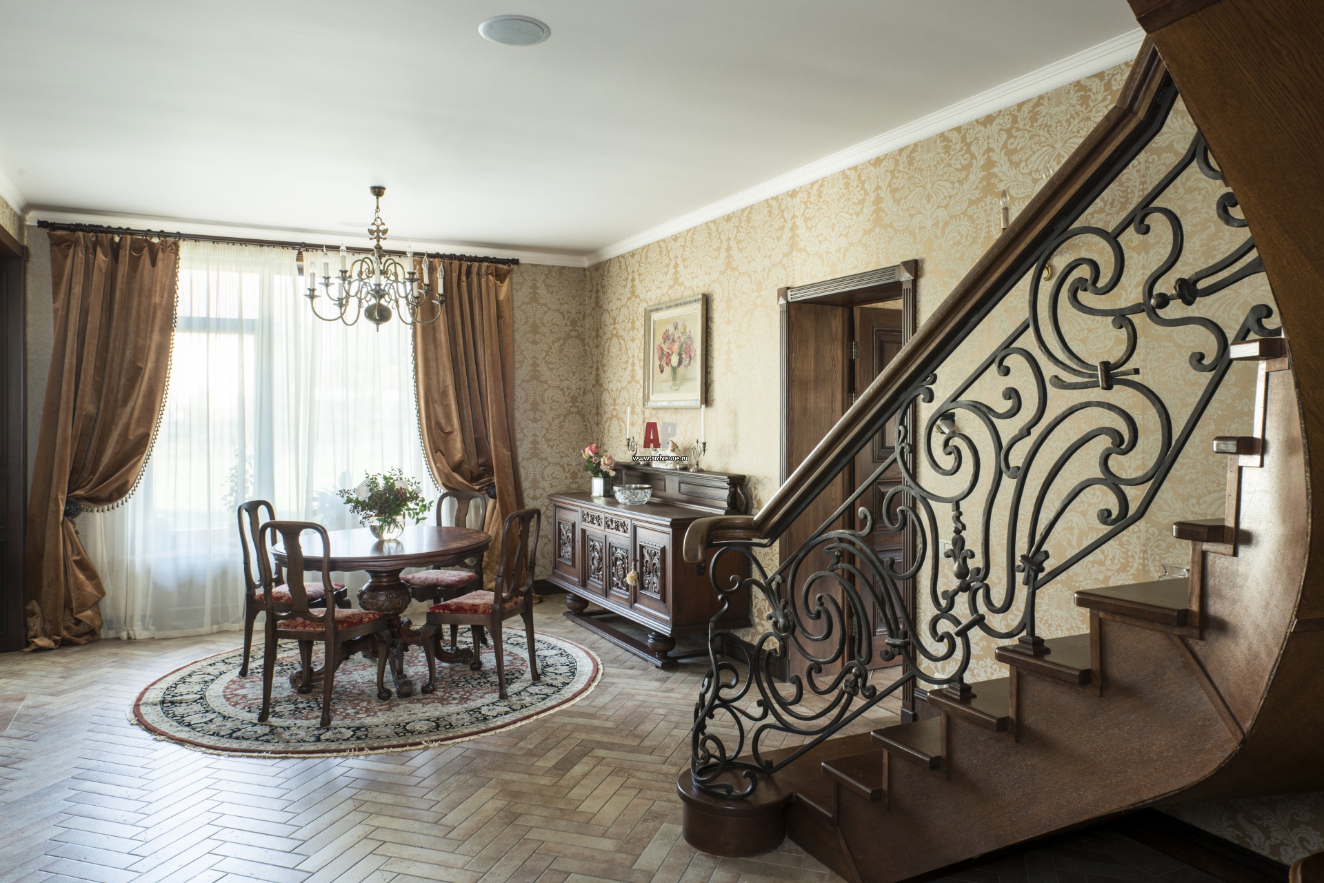 Часть интерьера столовой – изогнутая волной деревянная лестница с черным кованым ограждением. Выложенная елочкой плитка Tagina на полу отсылает к эстетике старинных европейских городов.