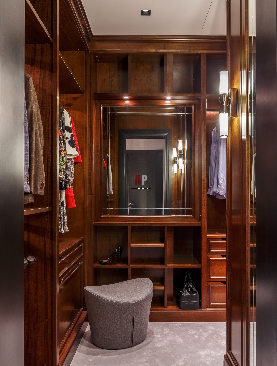 Гардеробная оформлена дерево. Мебель спроектирована на заказ и изготовлена в Италии.