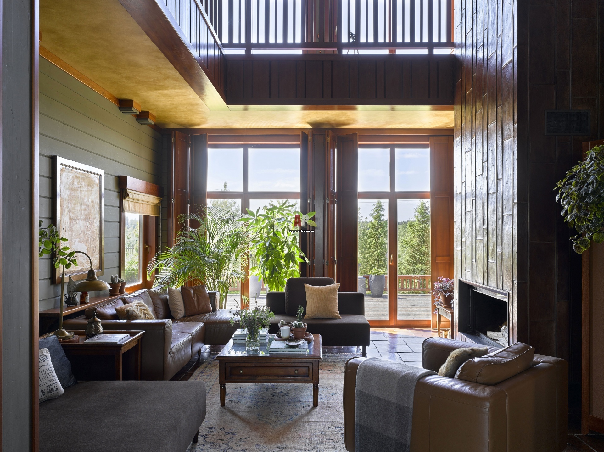 Фото интерьера гостиной деревянного дома в стиле фьюжн