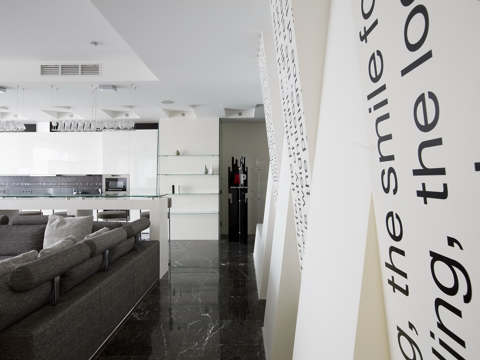 Стены и потолок гостиной оформлены наклонными плоскостями, расположенными под разными углами и складывающимися в «плетенку». Наклонные плоскости стены декорированы обоями с текстами на английском языке, привносящими в интерьер дополнительную динамику.