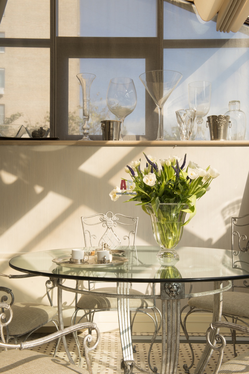 Столовая группа на террасе. Обеденный стол со стеклянной столешницей, кованые стулья с серебристой патиной. Пол из мраморной мозаики белого и черного цветов.