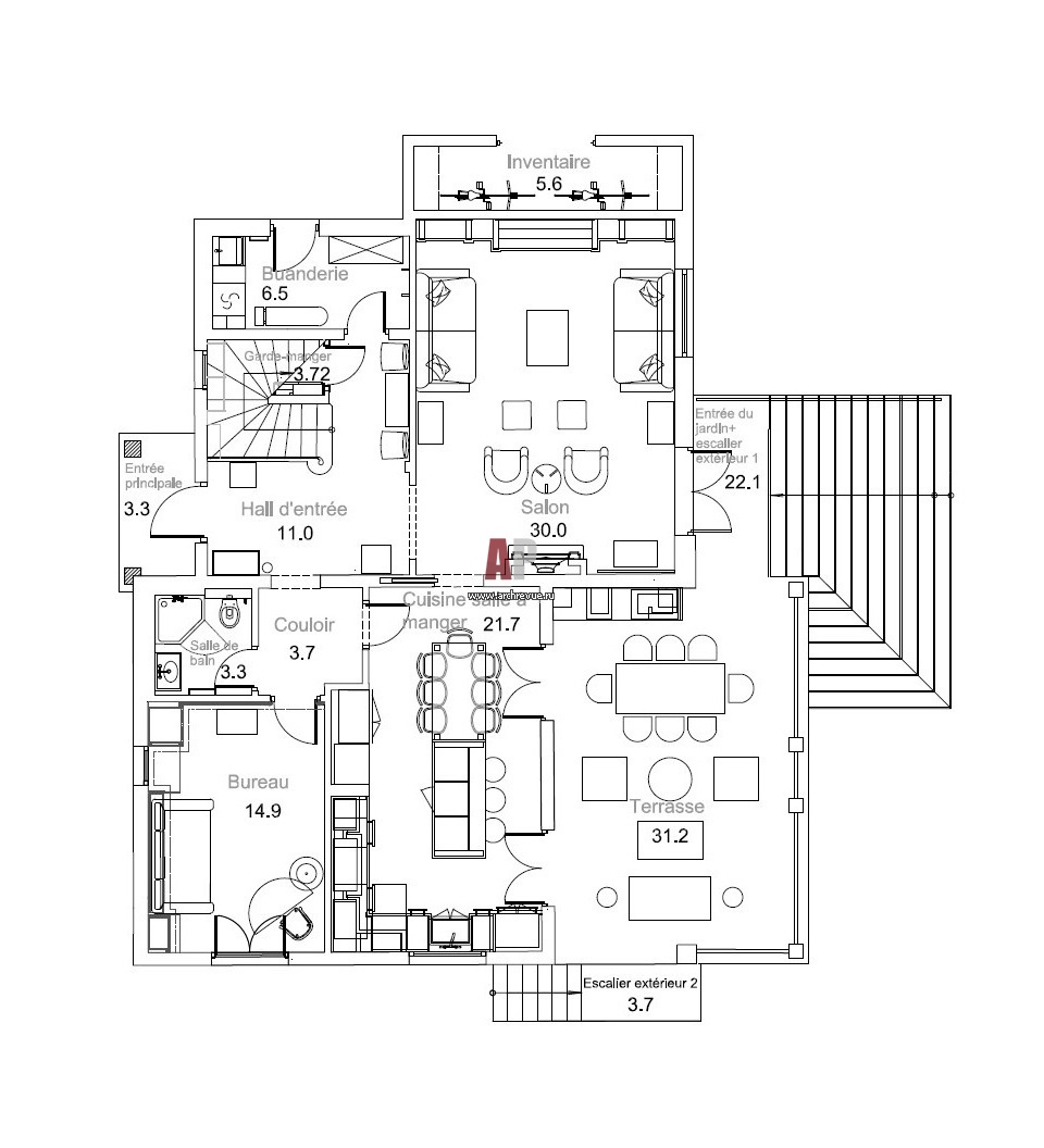 Планировка 1 этажа 2-х этажного дома на юге Франции. Общая площадь – 387 кв. м.
