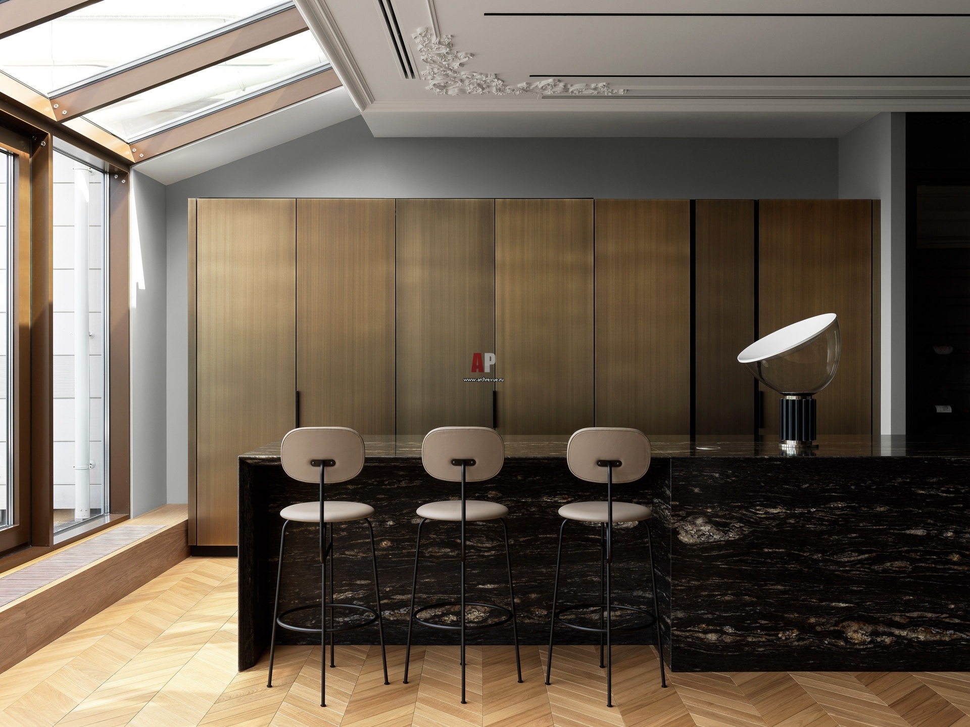 Изюминка интерьера – кухонный гарнитур Boffi с фасадами из латуни и гранитным островом. Полубарные стулья, Audo Copenhagen, модель Afteroom.