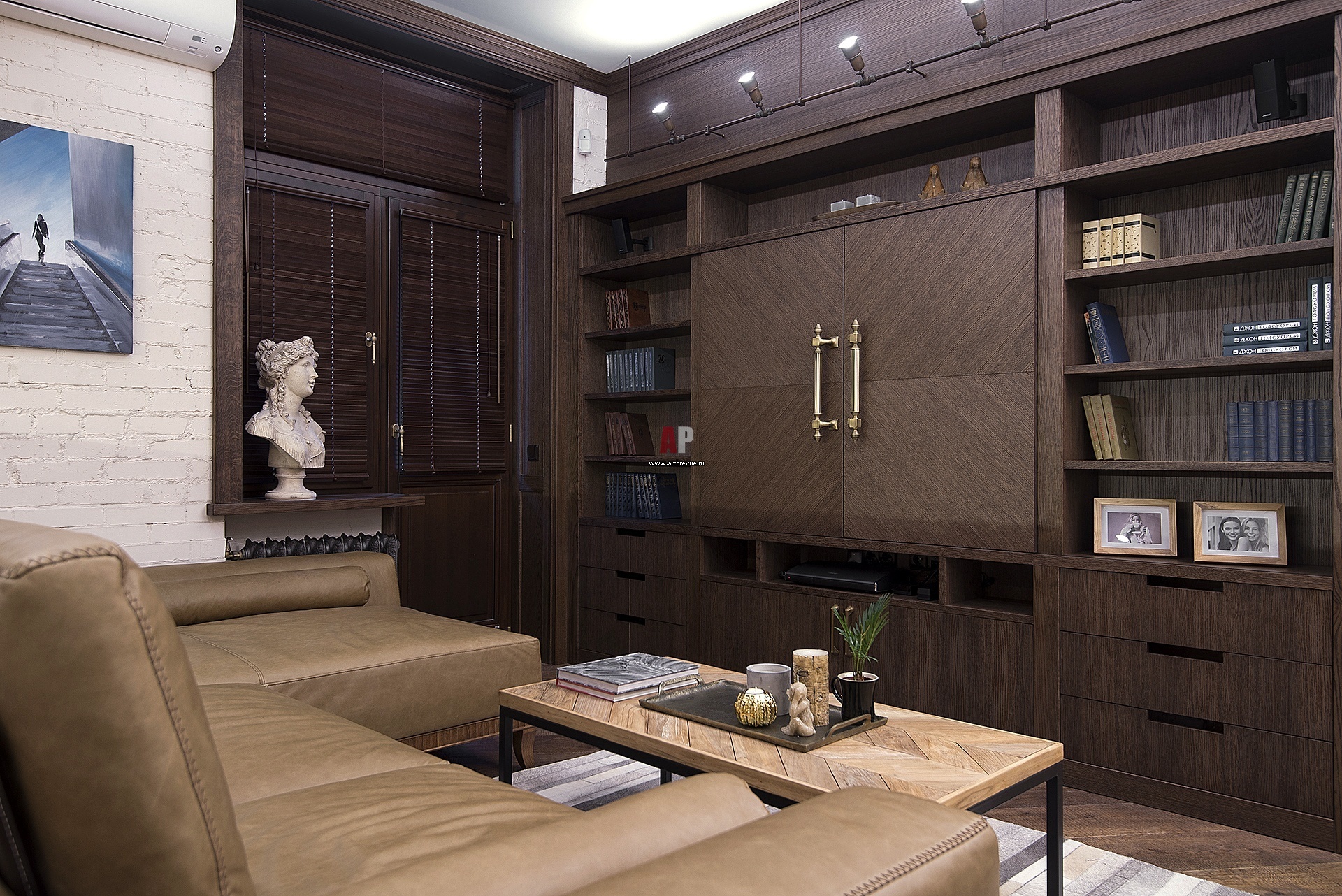 Центральные створки стеллажа закрываются, и экран ТВ полностью убирается. Металлическая мебельная фурнитура подобрана в стиле лофт. Лофтовый светильник на металлической шине, Aldo Bernardi.