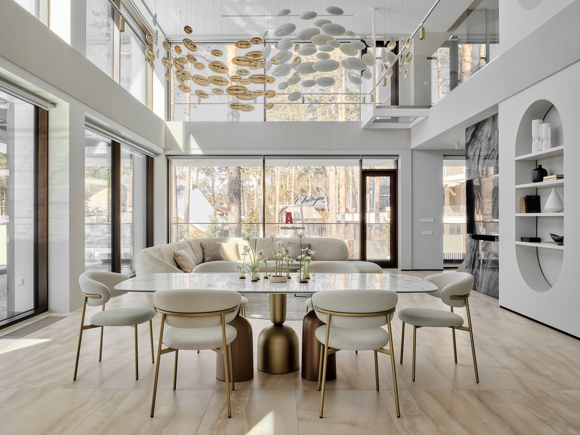 Акцент столовой группы – люстра высотой около 4 метров с подвесами в форме левитирующих чаш. Она создана на заказ по эскизам авторов проекта, вдохновением послужила коллекция SANS SOUCI фабрики Bowls.