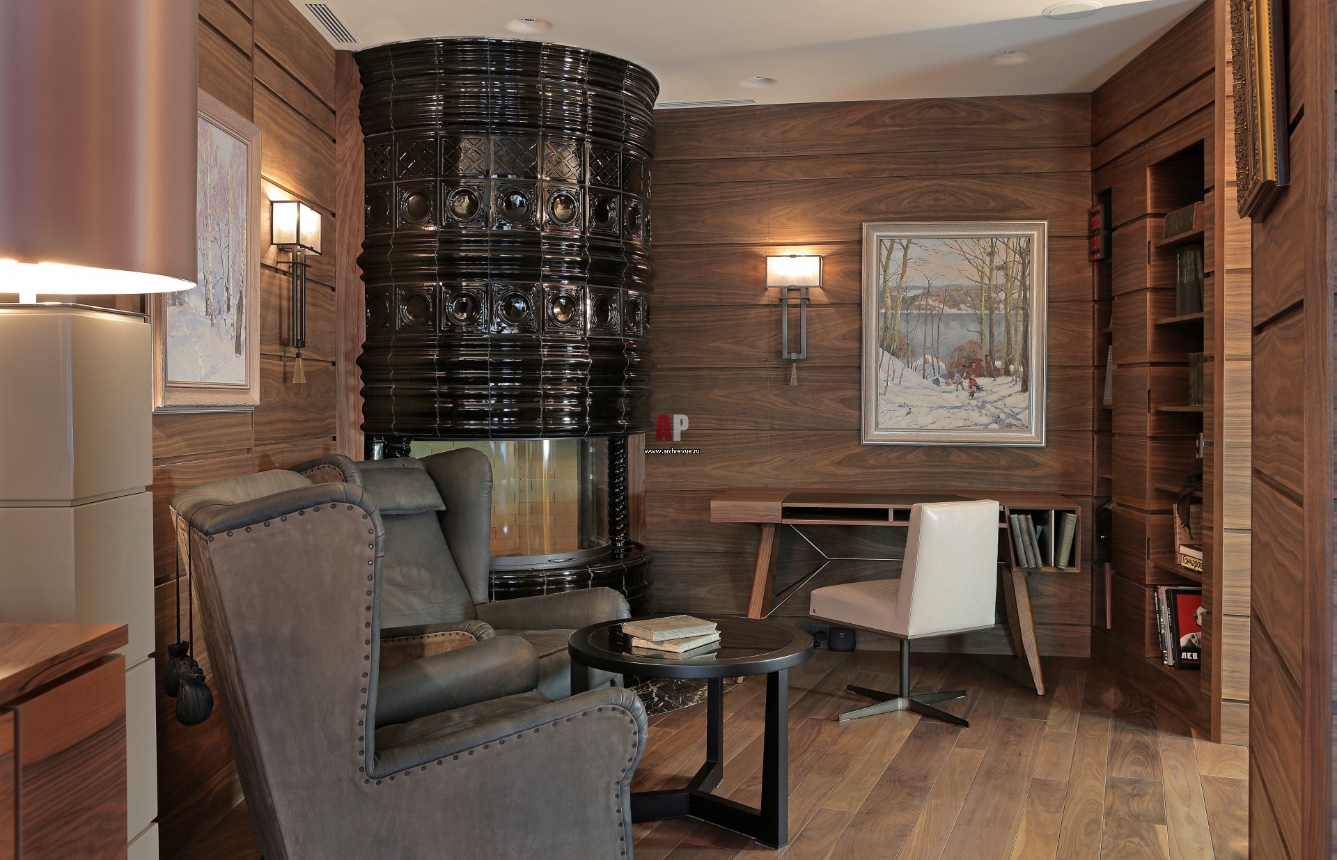 Каминная перед главной спальней. Полукруглый камин с черными изразцами изготовлен на заказ. Кожаные кресла, Baxter. Письменный стол из американского ореха, отделанный кожей, Arketipo. Кожаное рабочее кресло, Busnelli.