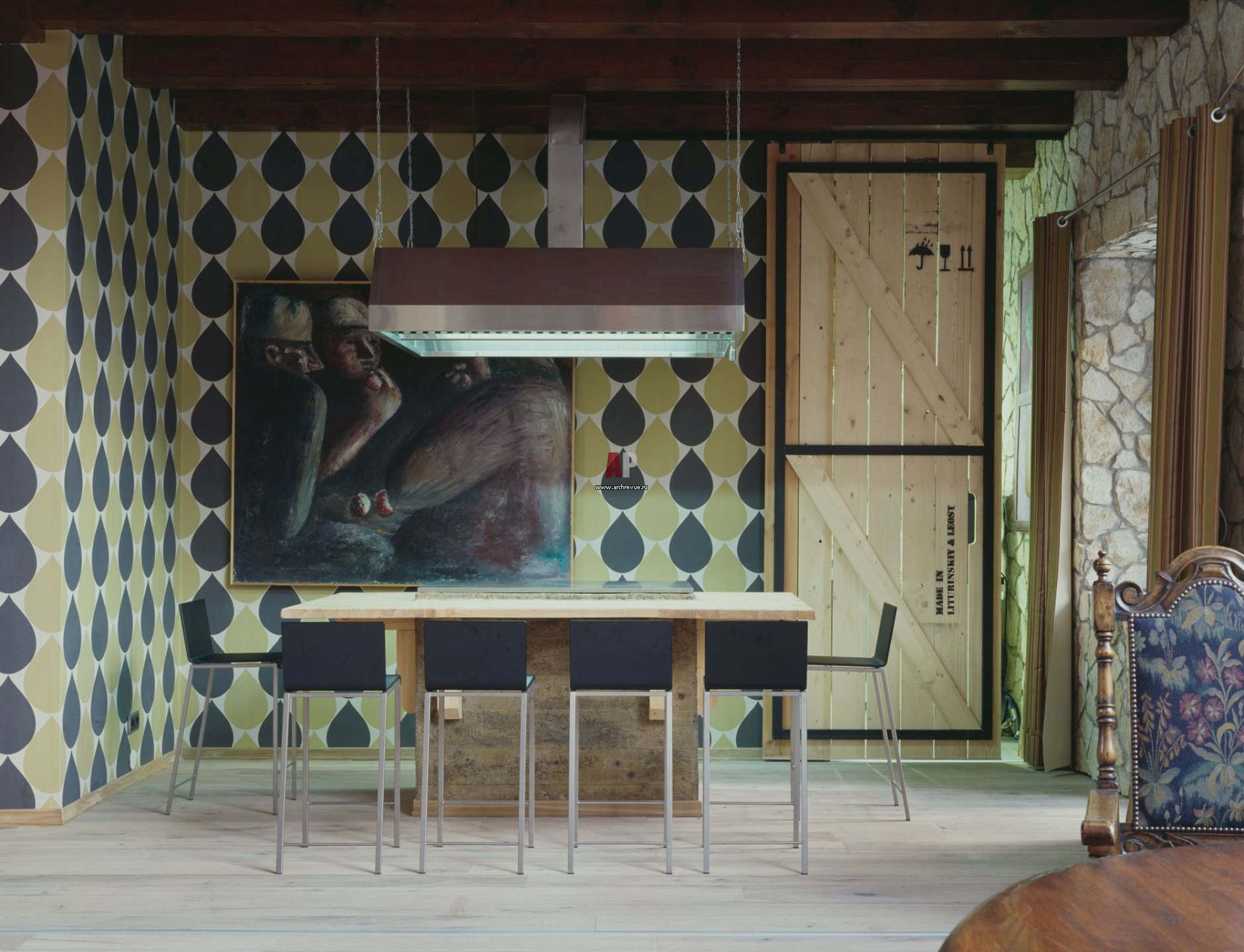 Кухня расположена за дверью, сколоченной из ящиков. Там стоит ресторанное оборудование и готовят профессиональные повара. Бар с тимпаном для приготовления восточных блюд сделан по эскизам авторов проекта и предназначен для кулинарных экспериментов хозяина дома и его гостей.