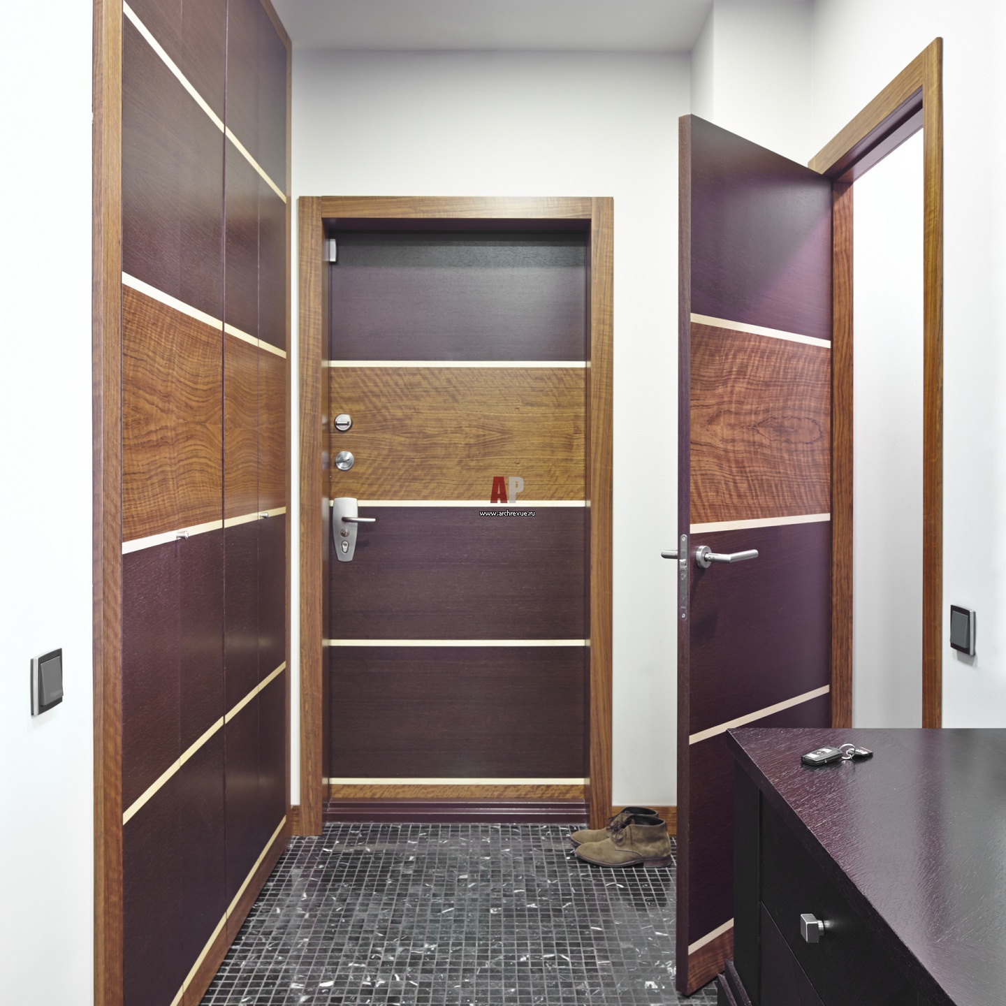 Интерьер прихожей современной квартиры. Входная дверь, межкомнатные двери, раздвижные двери шкафа-купе сделаны на заказ по чертежам архитектора. Горизонтальный рисунок из шпона ореха и дуба.