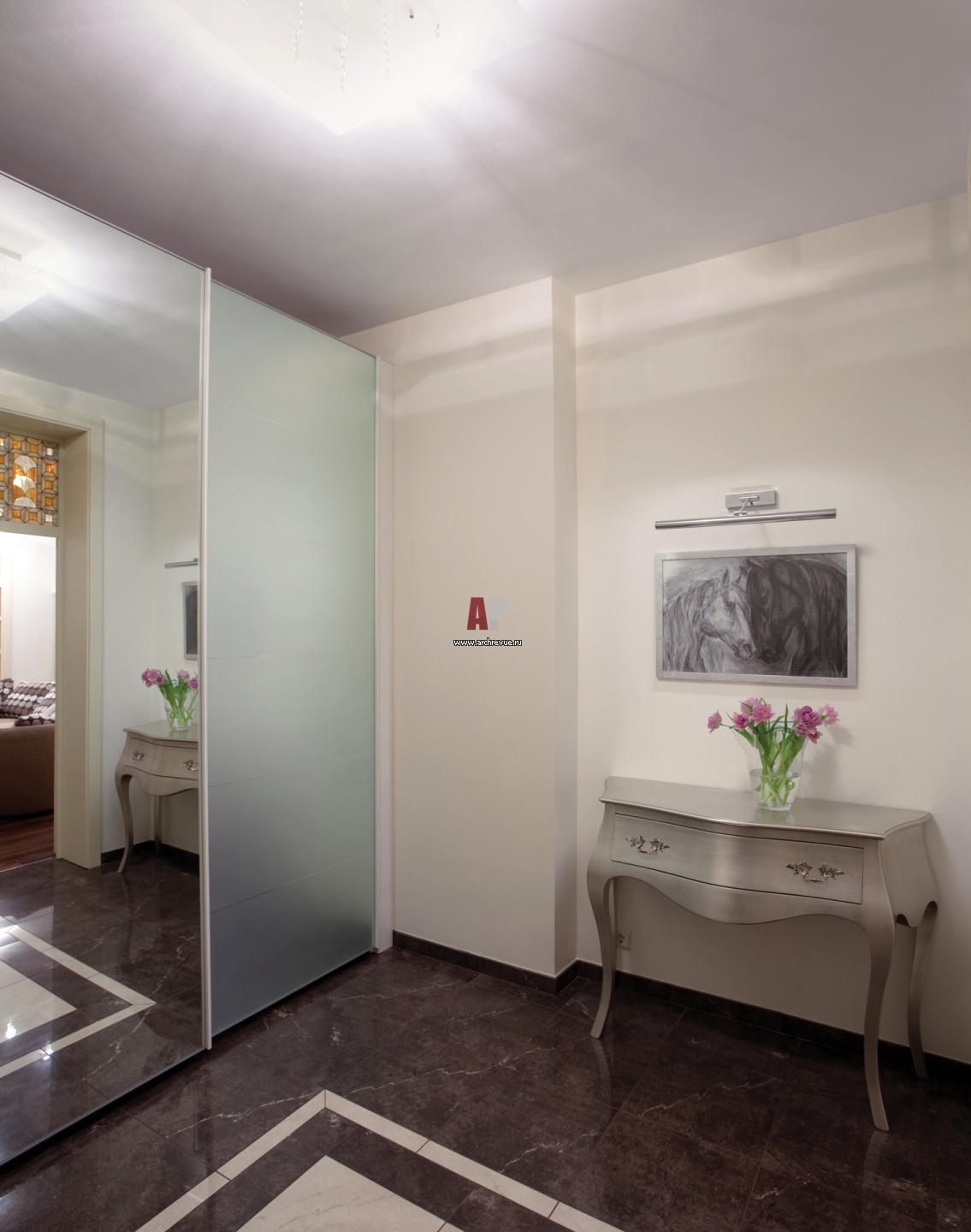 Фото интерьера прихожей в современном стиле с элементами классики. Встроенный шкаф с зеркальными панелями. Серебристый столик-консоль в стиле необарокко.