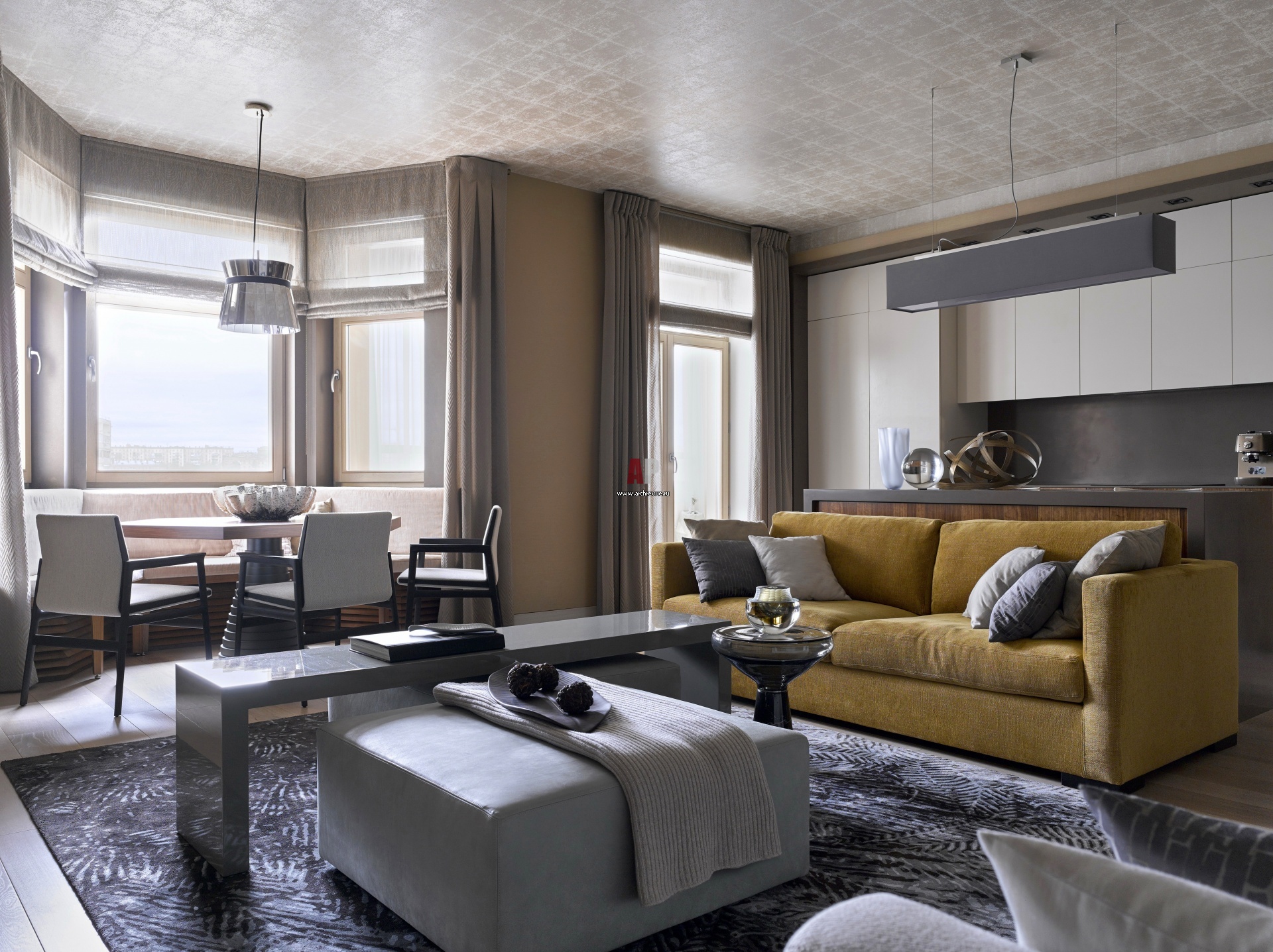 Гостиная объединена с кухней и столовой. Потолок покрыт поталью с рисунком-клеткой. На полу – доска, седой дуб.