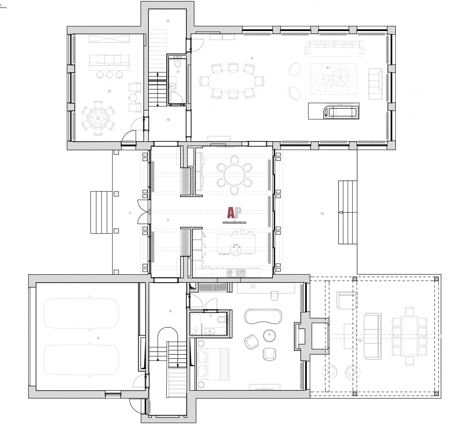 План первого этажа трехэтажного дома в лесу. Общая площадь – 850 кв. м.