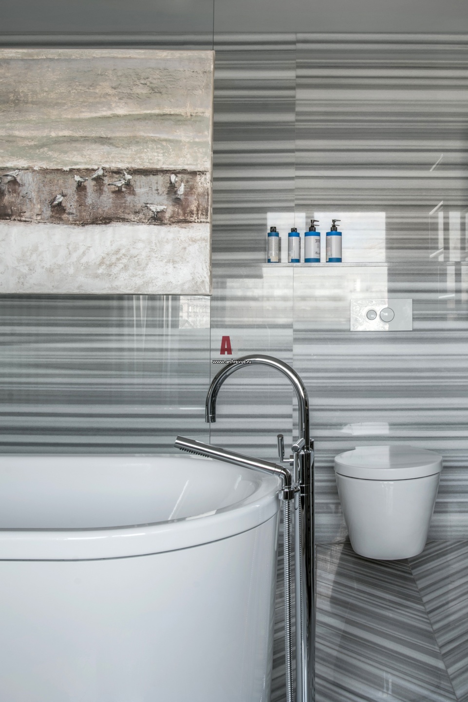 Хозяйская ванная комната. Стены и пол отделаны серым керамогранитом, Rex.