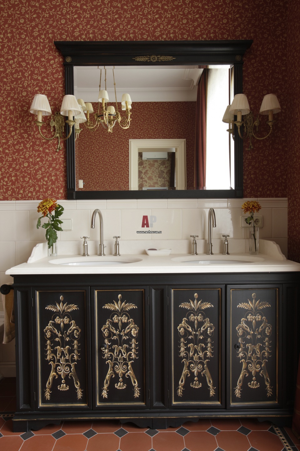 Интерьер гостевого санузла. Верхняя часть стен оформлена обоями, нижняя – белой глазурованной плиткой. На полу – метлахская плитка Original Style, поставщик «Интерьерный салон» («Биг Бен»).