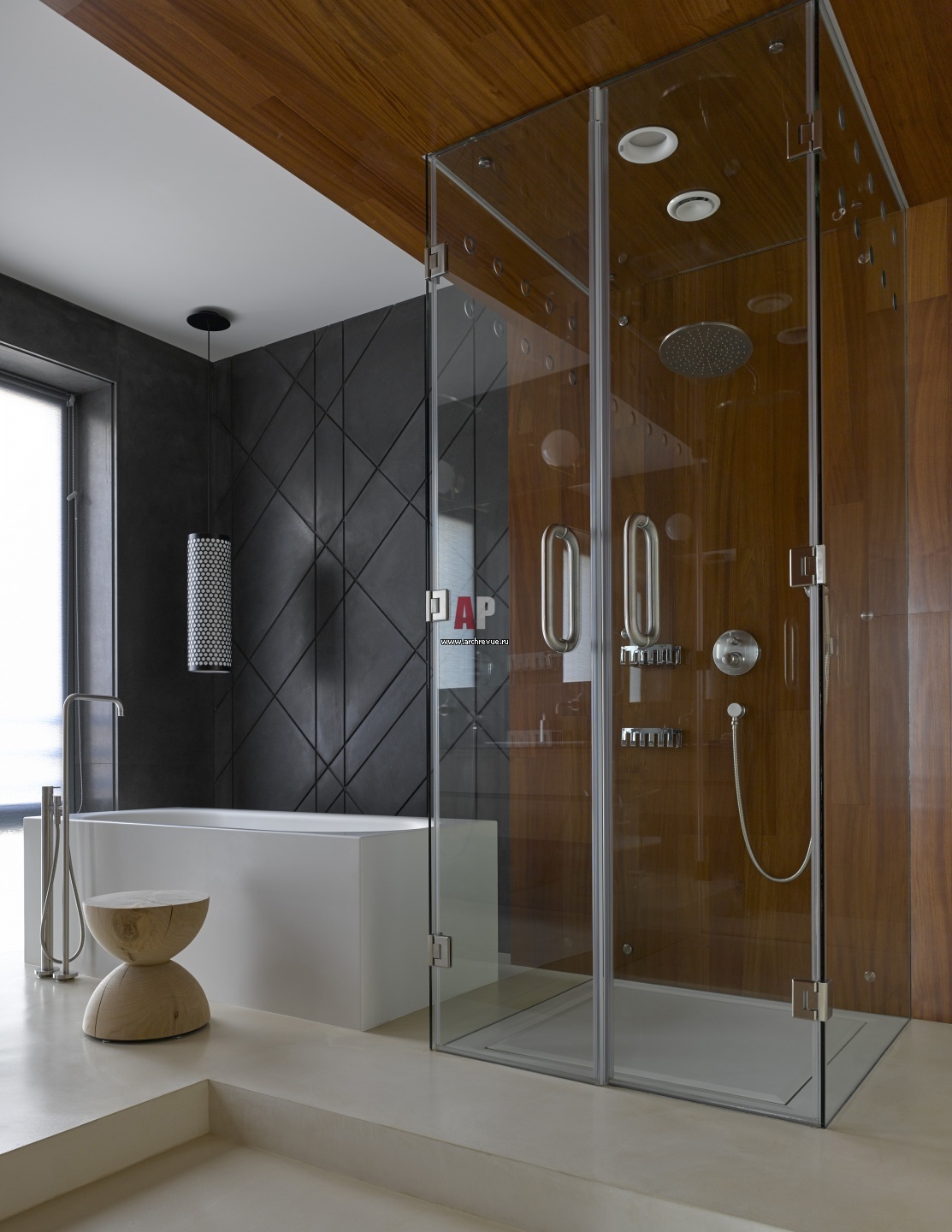 В отделке хозяйской ванной использован черный базальт, привезенный из Италии и распиленный по эскизам. В зоне душевой использовано натуральное дерево породы дуссия. Чтобы еще повысить износостойкость душевой, ее сделали с четырьмя стеклянными стенками, а стену, которая, прилегала к деревянной, загерметизировали.