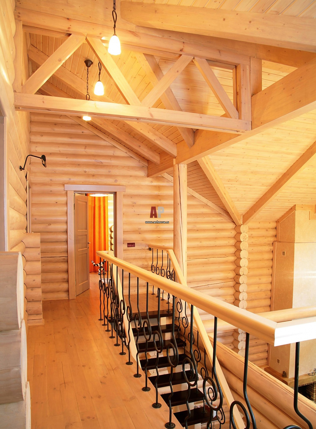Лестничный холл второго этажа. Разноуровневые стрельчатые потолки и обилие несущих конструкций продиктованы архитектурой дома.
