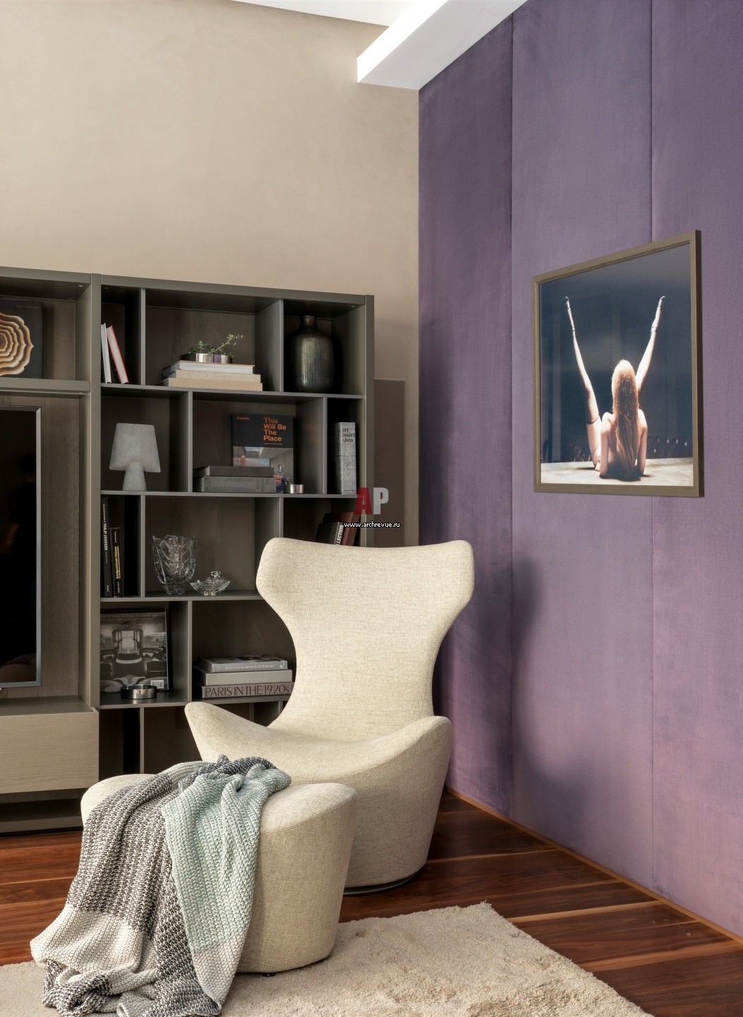 Зона отдыха в гостиной. Кресло, B&B Italia. Стеллаж, Poliform. Стена зашита панелями из ткани припыленного лавандового цвета. Фоторабота Полины Канис.
