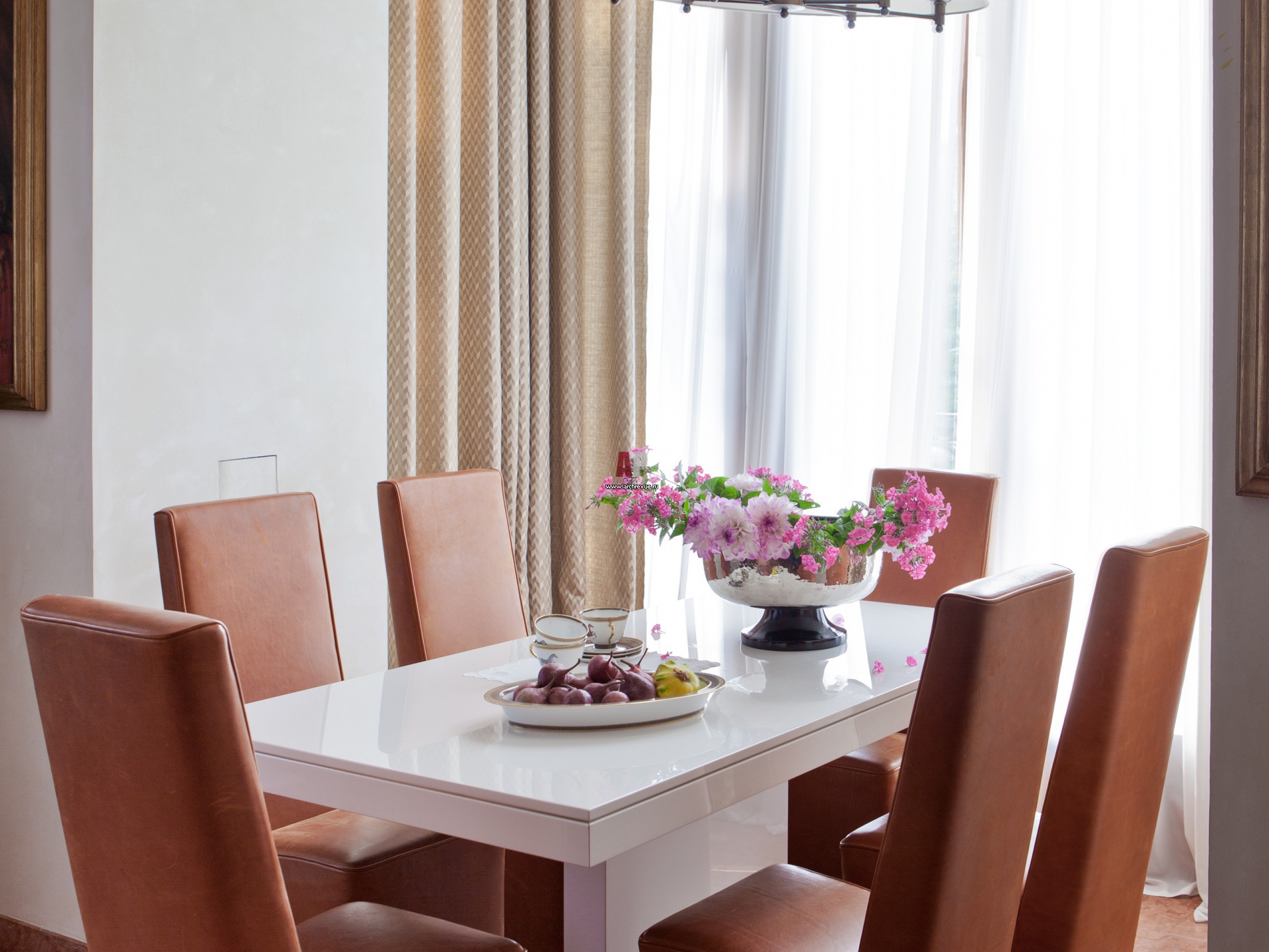 Зона для завтраков на кухне расположена в эркере. Белый лакированный стол, Rolf Benz. Кожаные рыжие стулья с высокими спинками, Baxter.