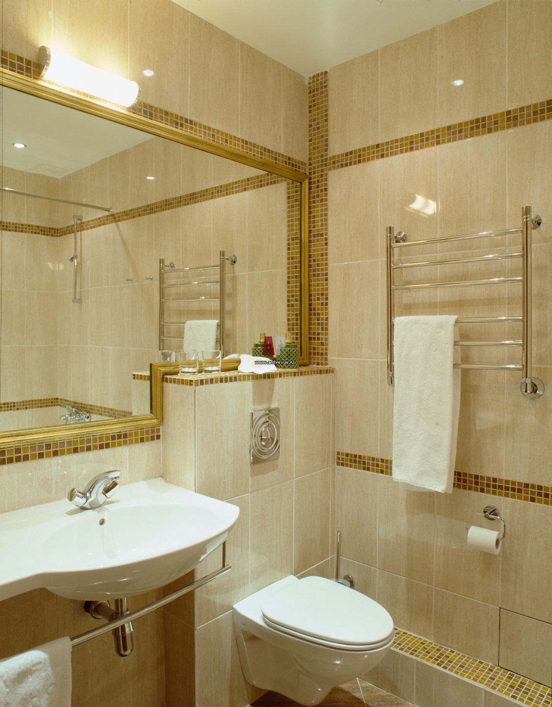 Санузел в номере-люкс облицован бежевой керамической плиткой, декоративные элементы выделены мозаикой на несколько тонов темнее.