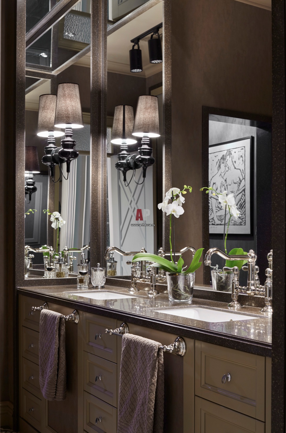 Интерьер гостевого санузла. Тумба под раковины выполнена по индивидуальным чертежам. Обои, Texdecor. Керамическая плитка, Iris Ceramica. Сантехника, Devon & Devon. Смесители, Nicolazzi.