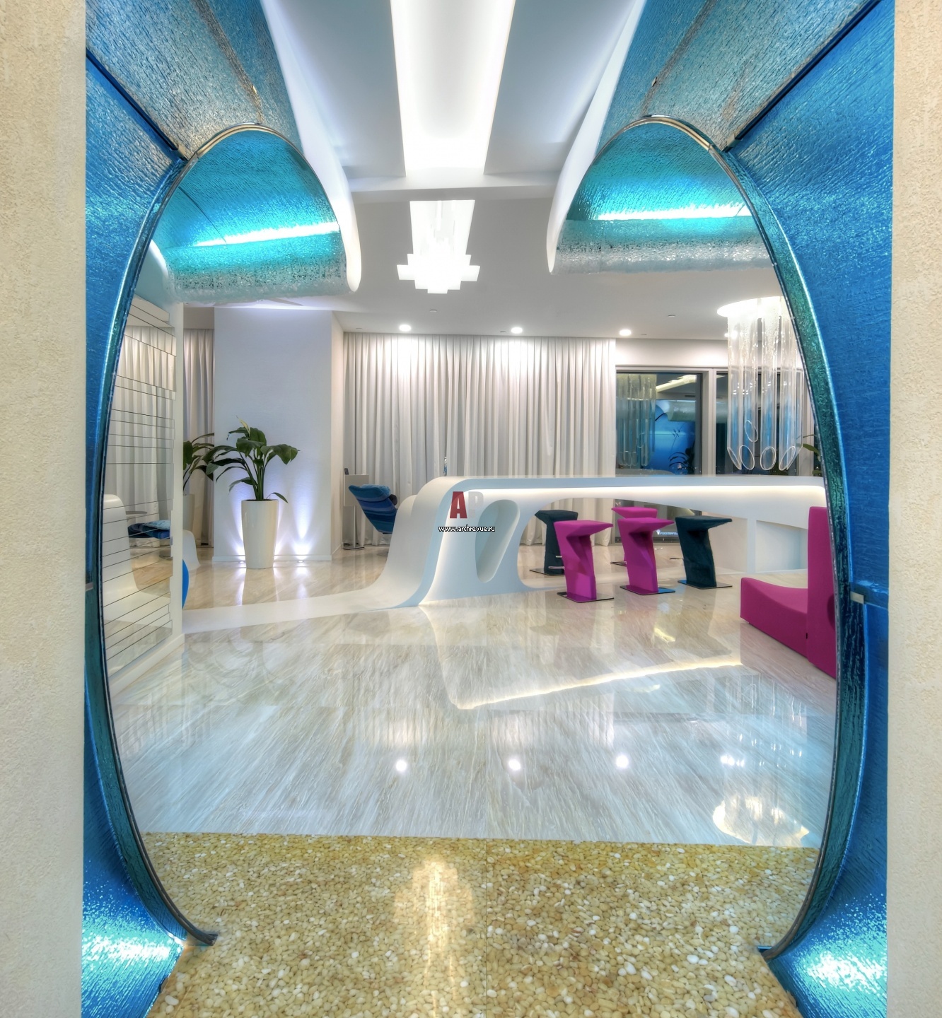 Вектор движения обозначен еще в прихожей: канал потолочного светильника, разрезающий потолок, дает четкий ориентир. На полу - декоративный акрил с природной галькой, имитирующий линию прибоя.