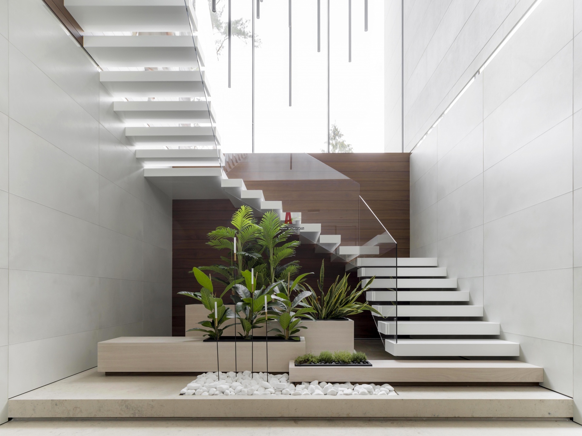 Лестница включена в общее пространство первого этажа, холл оснащен дополнительным окном, которое пропускает полуденное солнце в гостиную. Ступени выполнен из МДФ и белой эмали, ограждение из прозрачного безрамного стекла.