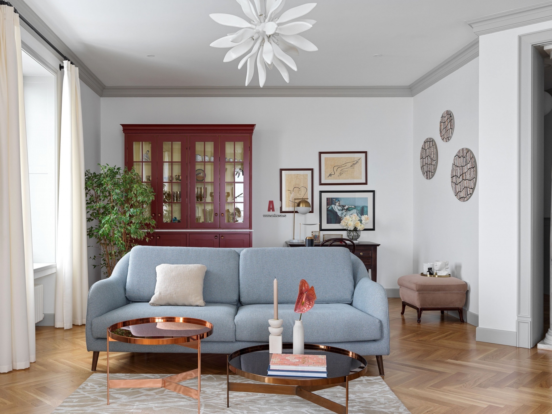 Интерьер гостиной. Дубовый паркет, уложенный французской елкой, прекрасно вписался в новый интерьер. Диваны, Sits. Акцентный буфет сделан на заказ. Круглые панно на стене выполнены из мозаики, художник – Дарья Заитова.