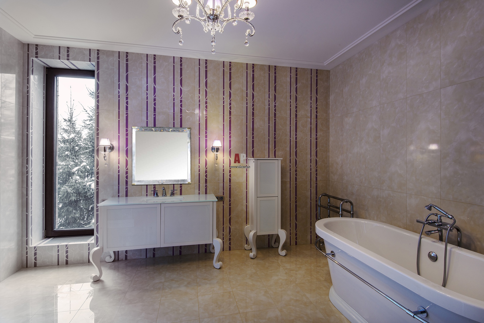 Интерьер ванной комнаты с вертикальным окном на втором этаже дома.