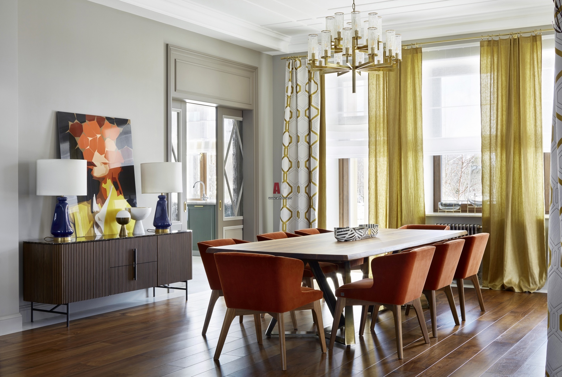 Интерьер столовой с элементами ар-деко. Обеденный стол, Bontempi. Стулья, Medea. Люстра из латуни и стекла, Visual Comfort & Co by Kelly Wearstler. Портьеры с орнаментом в стиле начала ХХ века, RM Coco и JAB.