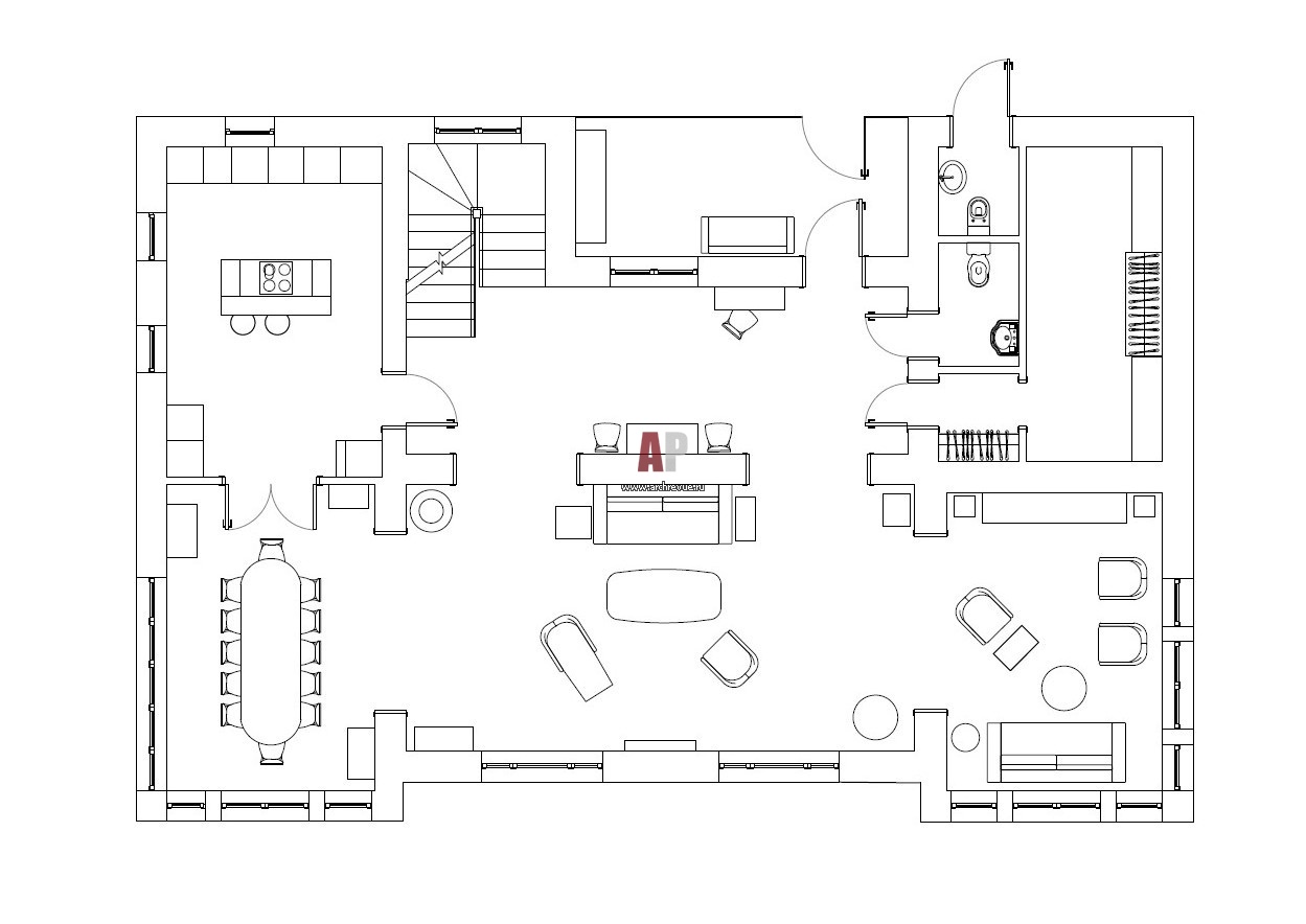План первого этажа трехэтажного дома после реконструкции. Общая площадь - 450 кв. м.