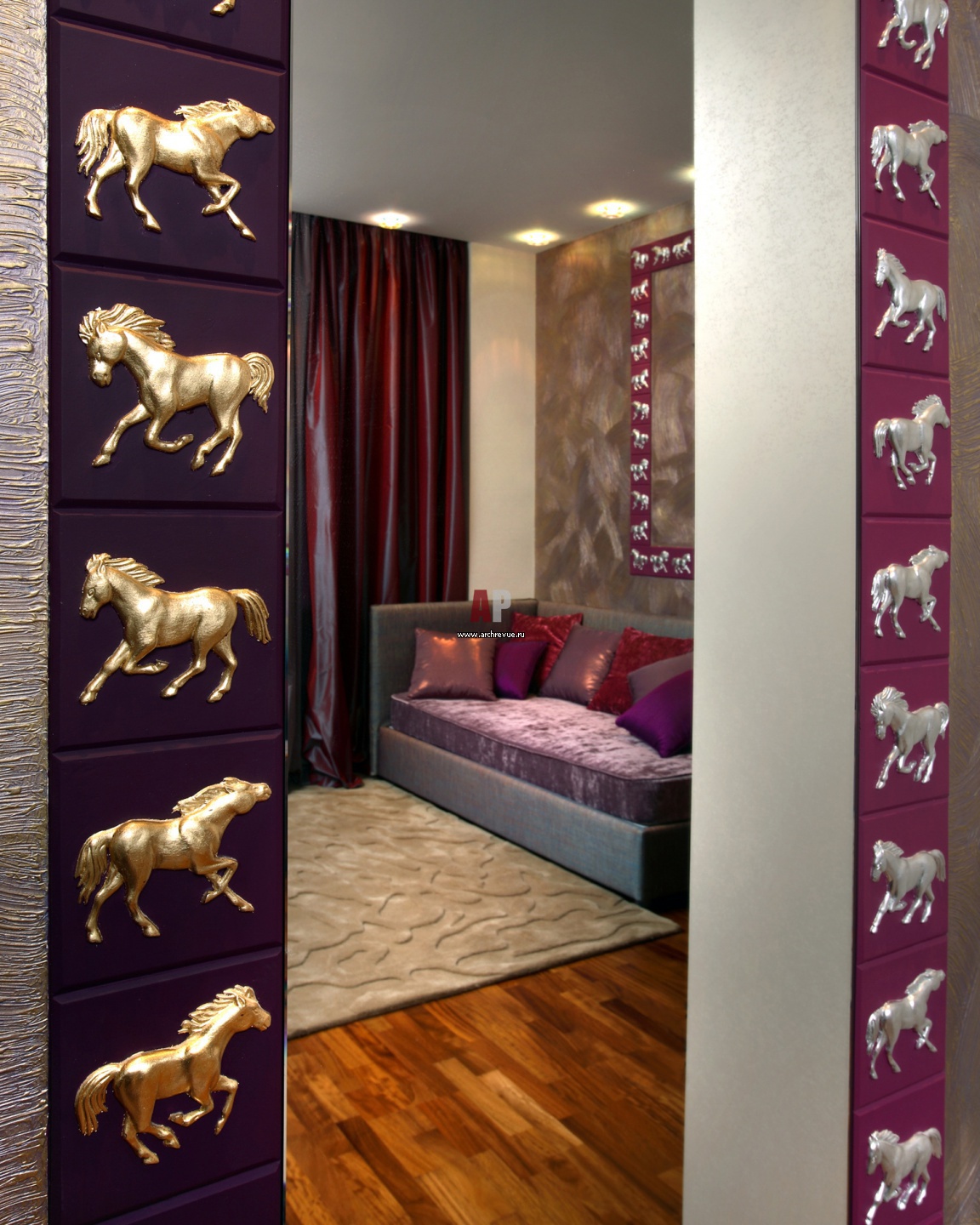 Отражение интерьера спальни в зеркале. Кант с фигурами лошадей сделан из гипса.