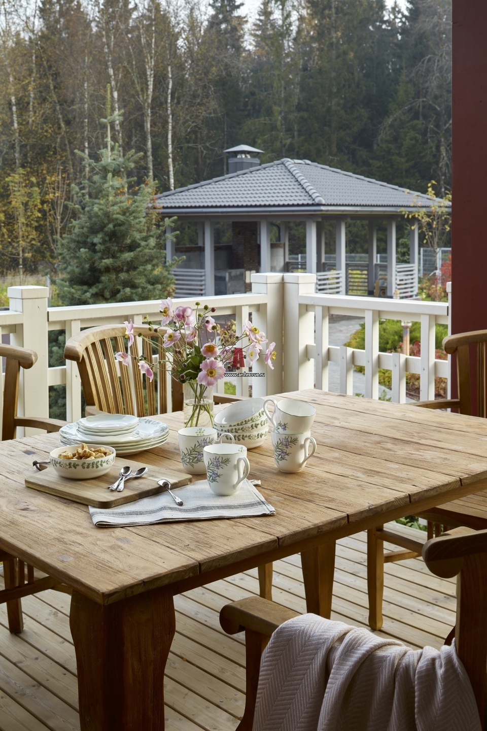 Деревянный дом на краю леса. На террасу можно попасть из общей гостиной. Летом здесь накрывается стол для трапез на открытом воздухе.
