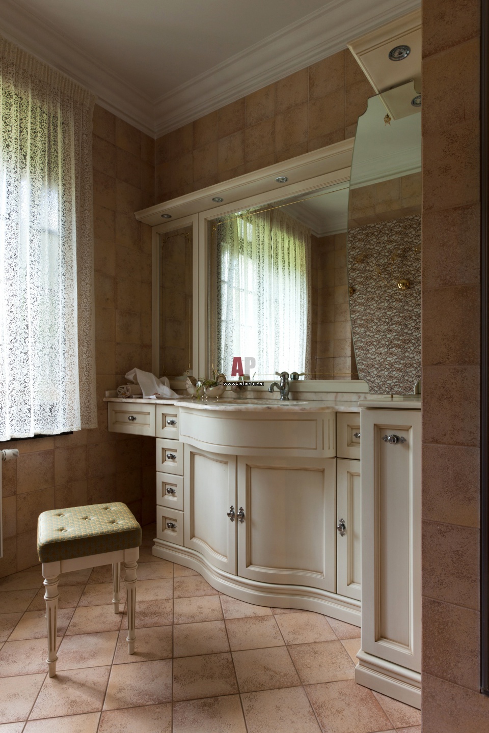 Интерьер ванной комнаты в классическом французском стиле. Умывальник от Eurodesign выполнен из дерева с эмалью цвета «слоновая кость».