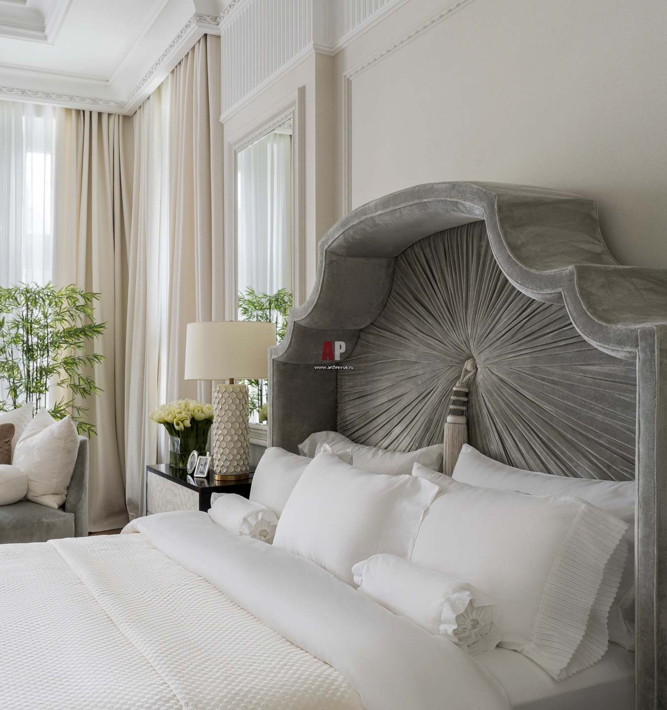 Спальня оформлена в бежево-розовых и жемчужных тонах. Кровать со стилизованным балдахином, Haute House.