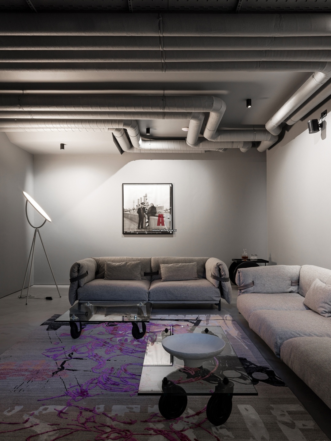Кинозал в подвальном этаже. Диваны, Desalto. Столики, FontanaArte. Торшер, Flos. Ковер Татьяны Ахметгалиевой. Картина В. Мамышева-Монро.