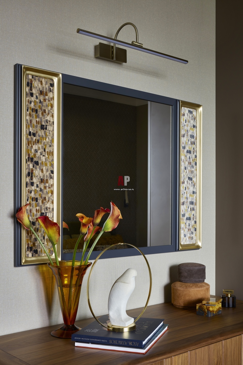 Фрагмент женской спальни. Тумба, шпон ореха, Modo10. Над ней зеркало со вставками из бархата, на заказ. Скульптура «Сокол» и ваза, винтаж, Франция. Аксесуары, BoConcept.