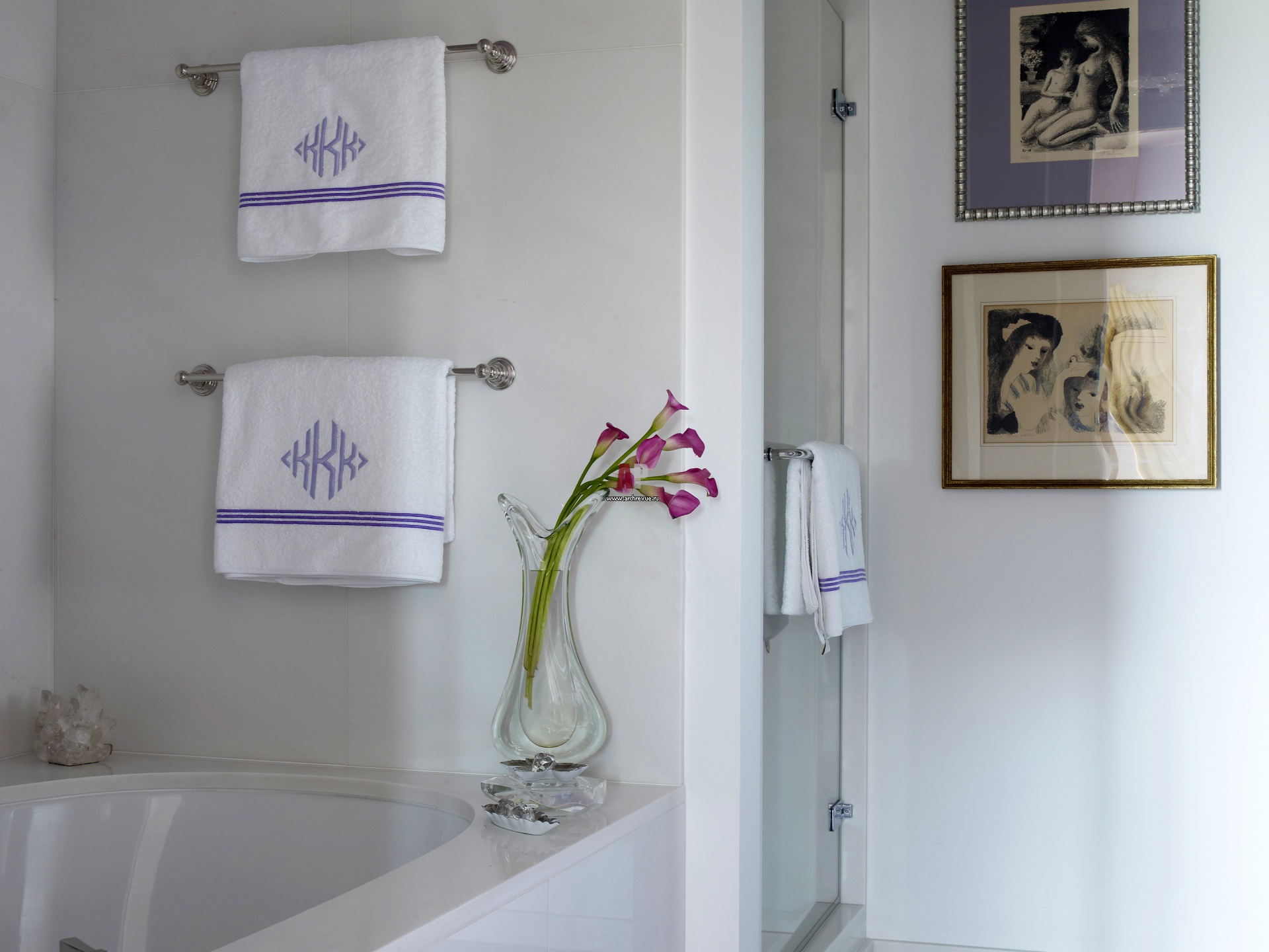 Ванная комната при хозяйской спальне выполнена в бело-сиреневой гамме.