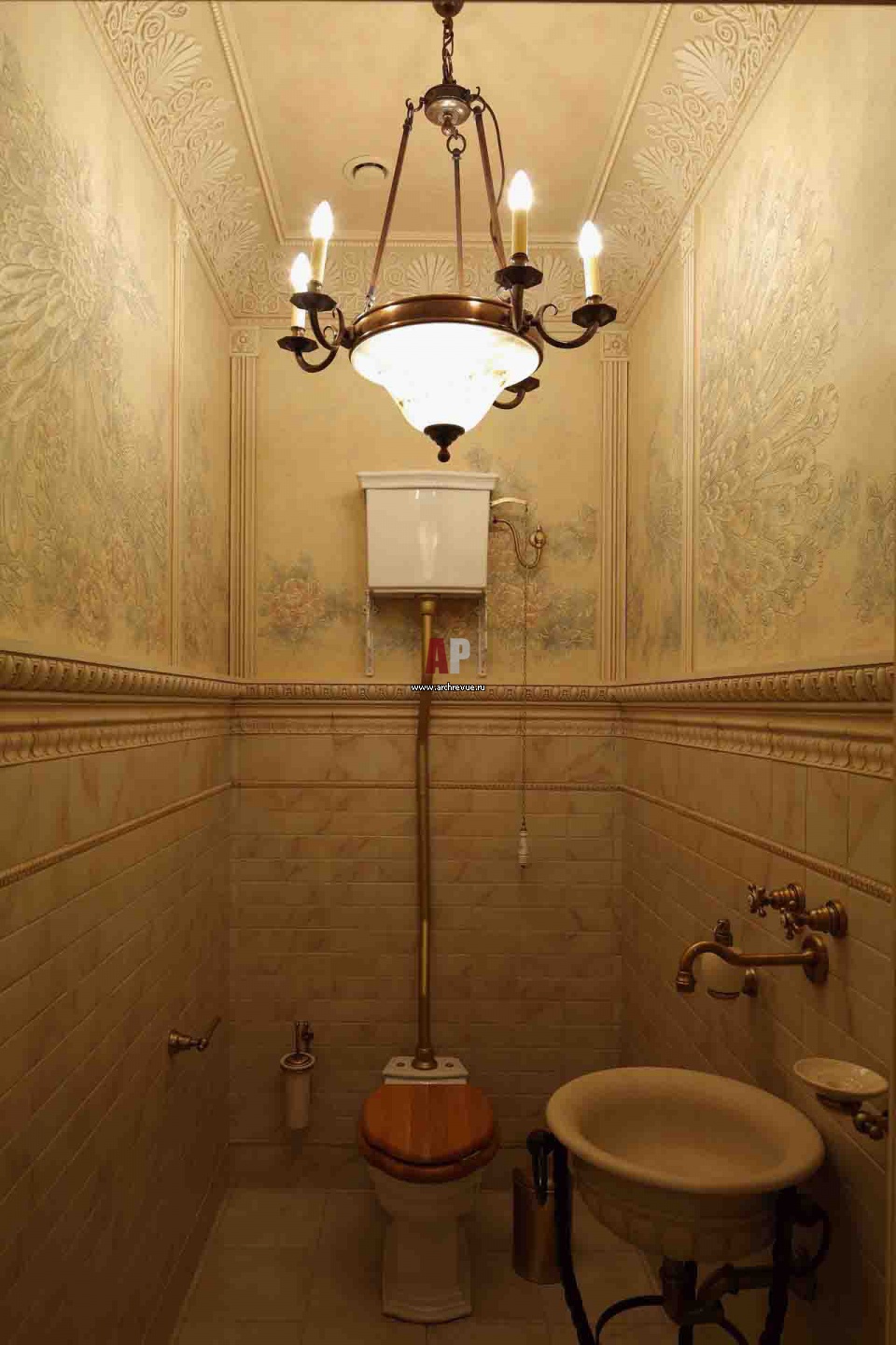 Гостевой санузел. На стенах – рельефные обои с изображением павлинов. Декоративный фриз с кельтским орнаментом из гипса с росписью.