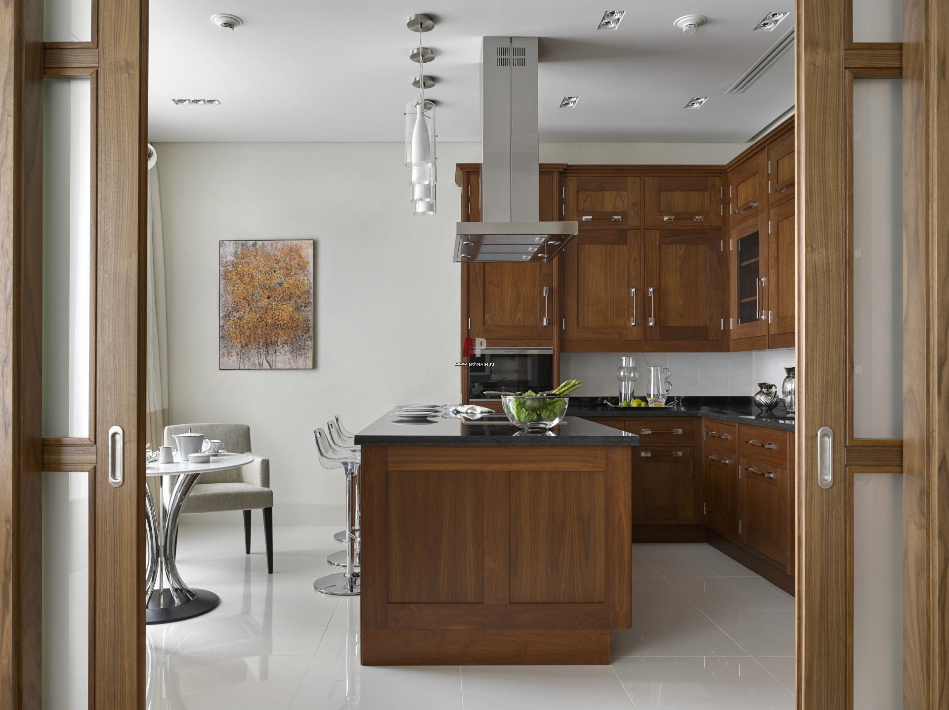 Между кухней и столовой – раздвижная перегородка. Кухонный гарнитур Christopher Peacock (Великобритания) соединил в себе черты классики и современности. И фасады, и корпус кухни выполнен из древесины ореха. Ручки – комбинация тонких деревянных палочек и никелированных креплений.