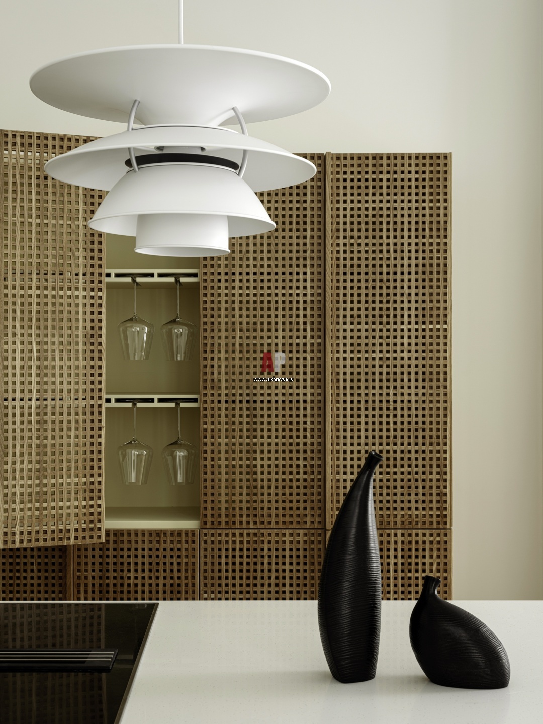 Кухня. Шкаф-бар с фасадами из массива дуба с мелким ритмом квадратов сделан на заказ. Внутри он выкрашен в нежно-лимонный цвет. Дверки складываются по принципу раскладушки, можно открыть отдельно верхние или нижние створки. И в этом тоже есть смысл – так как кухня небольшая, даже при большом застолье, баром пользоваться удобно.