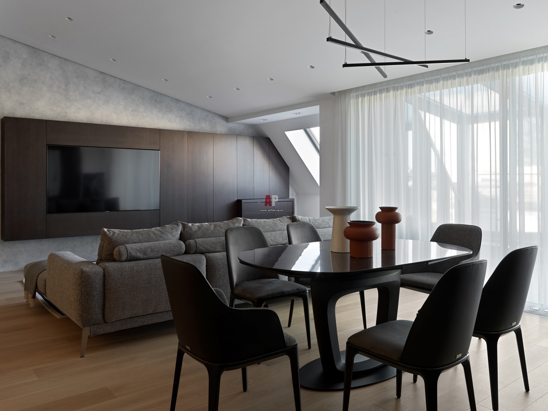 Интерьер общей зоны строится на трех материалах: дереве, широкоформатном керамограните под камень и декоративной штукатурке.