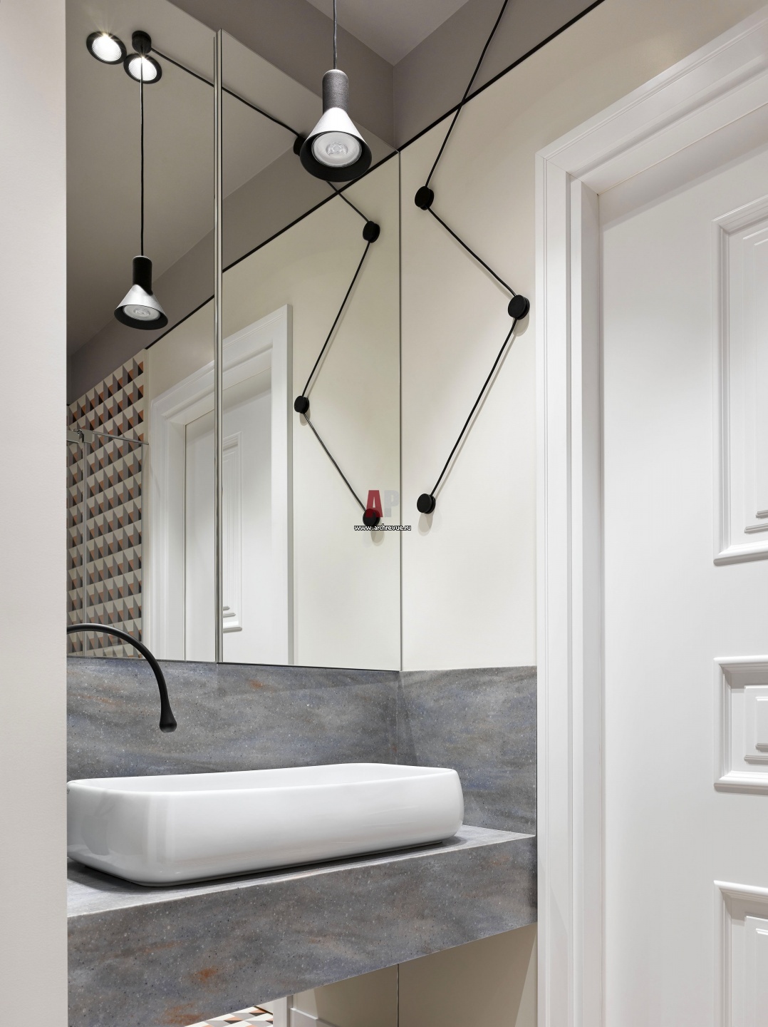 Интерьер санузла. Столешница под раковину выполнена из искусственного камня. Накладная раковина, Agape. Смеситель с картриджем Ecototal позволяет сократить потребление воды и электричества за счет ограничителей потока воды и температуры. Светильник, Davide Groppi.