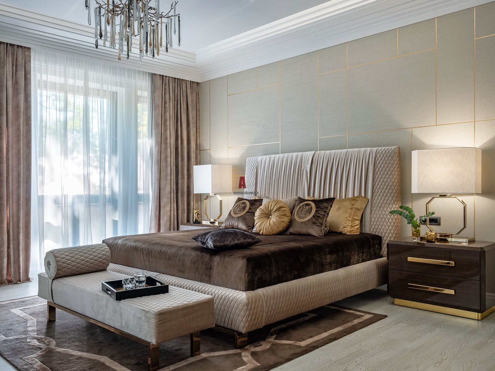 Хозяйская спальня оформлена в жемчужно-шоколадных тонах. Стены отделаны декоративным финишем Travertino Romano, Oikos, в составе которого – мрамор и кварц. Ритм интерьеру придают позолоченные вставки. Кровать, кушетка, прикроватные тумбы, Giorgio Collection, коллекция Infiniti. Люстра, Serip.