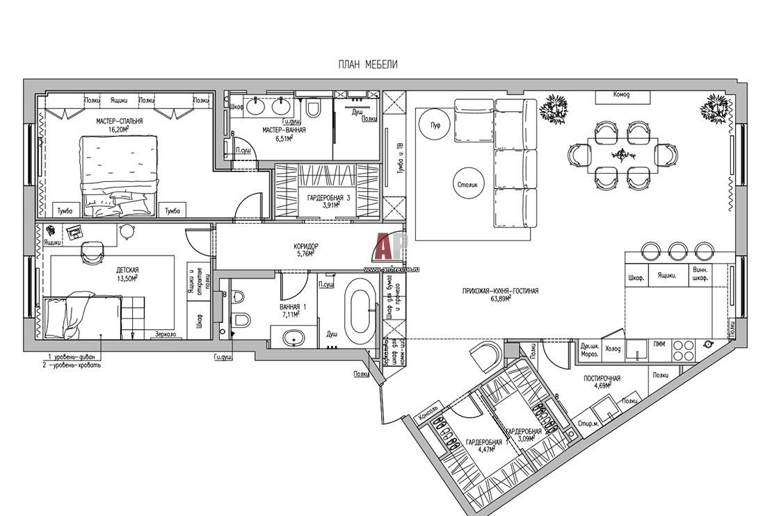 План 3-х комнатной квартиры в ЖК Royal Park, Санкт-Петербург. Общая площадь – 129 кв. м.