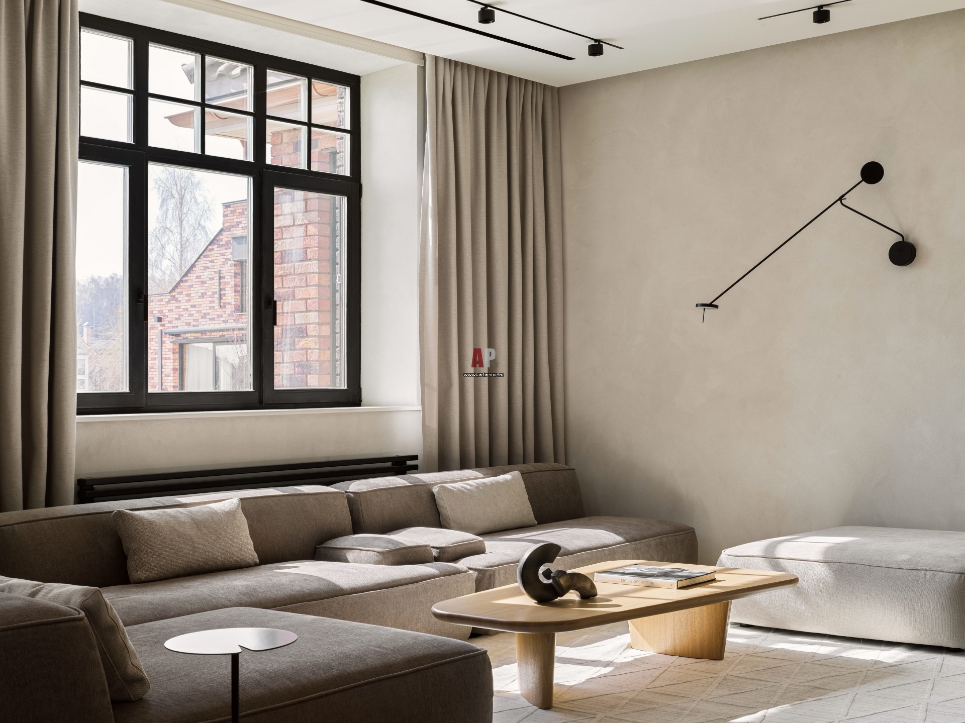 Диванная группа в общей гостиной. Диваны, Lema. Придиванный журнальный столик, на заказ, по эскизам дизайнеров. Чтобы добиться ощущения цельности улицы и интерьера, один только фоновый цвет стен архитекторы выбирали из почти что 20 близких оттенков!
