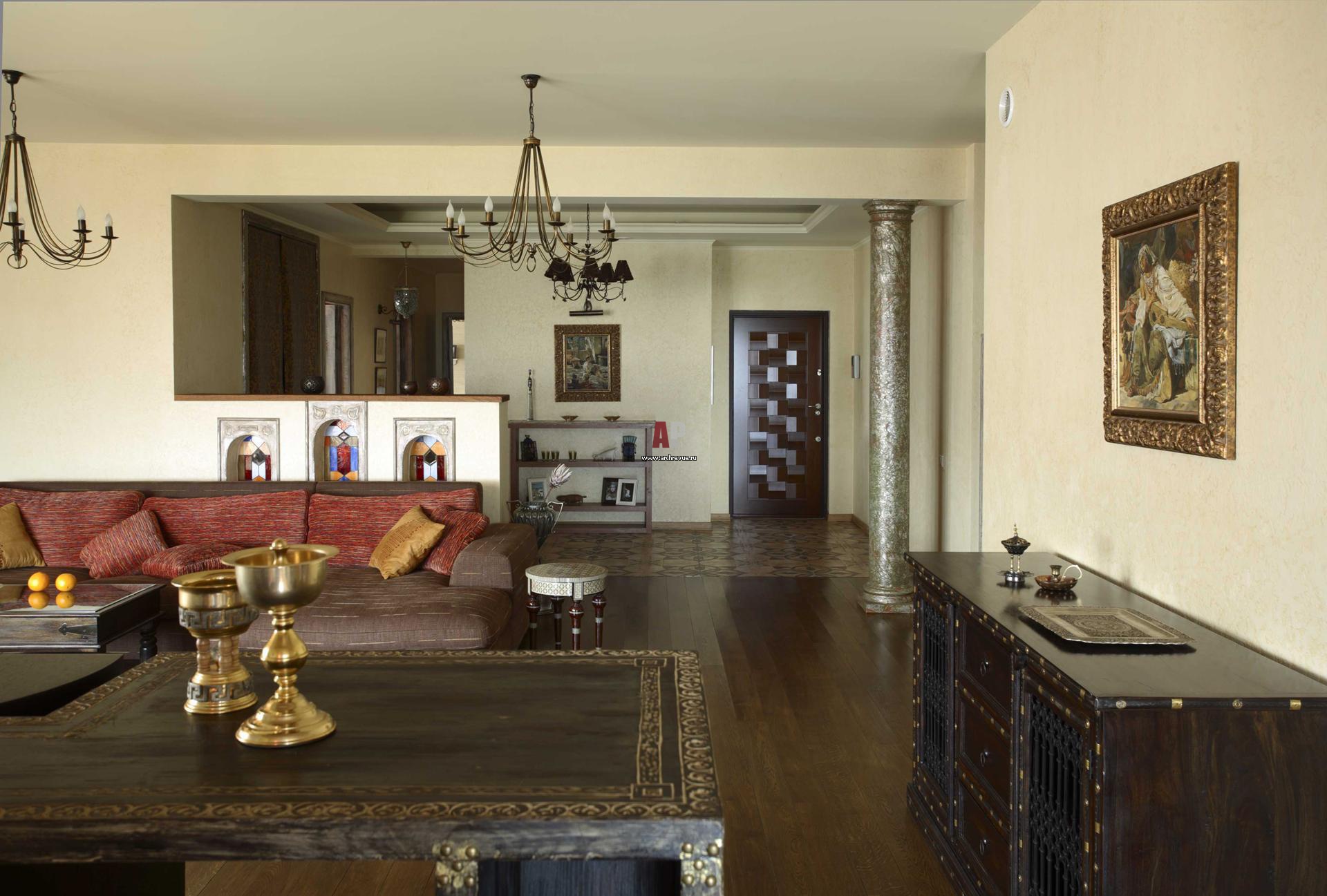 Гостиную зонирует подиум и выступающая часть стены, декорированная арочными витражными вставками, изготовитель «Скляне Свитло».